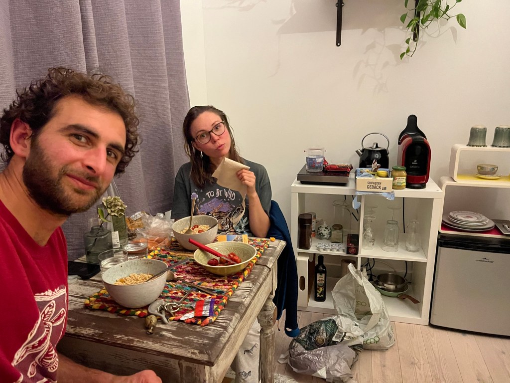 Jonathan ran to the shop while seeking advice on the phone from his brother. The only shop was a petrol station: Rewe. So noodles was dinner. 2 packs for 2€ and 2 each. Also a jar of Apfelmus (apple sauce) to go with the cookies.