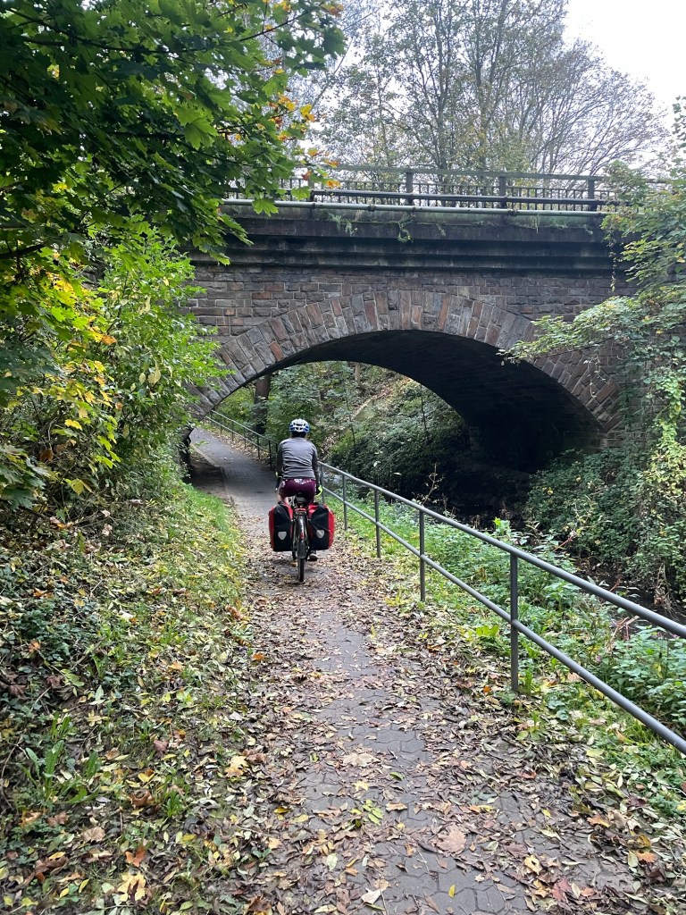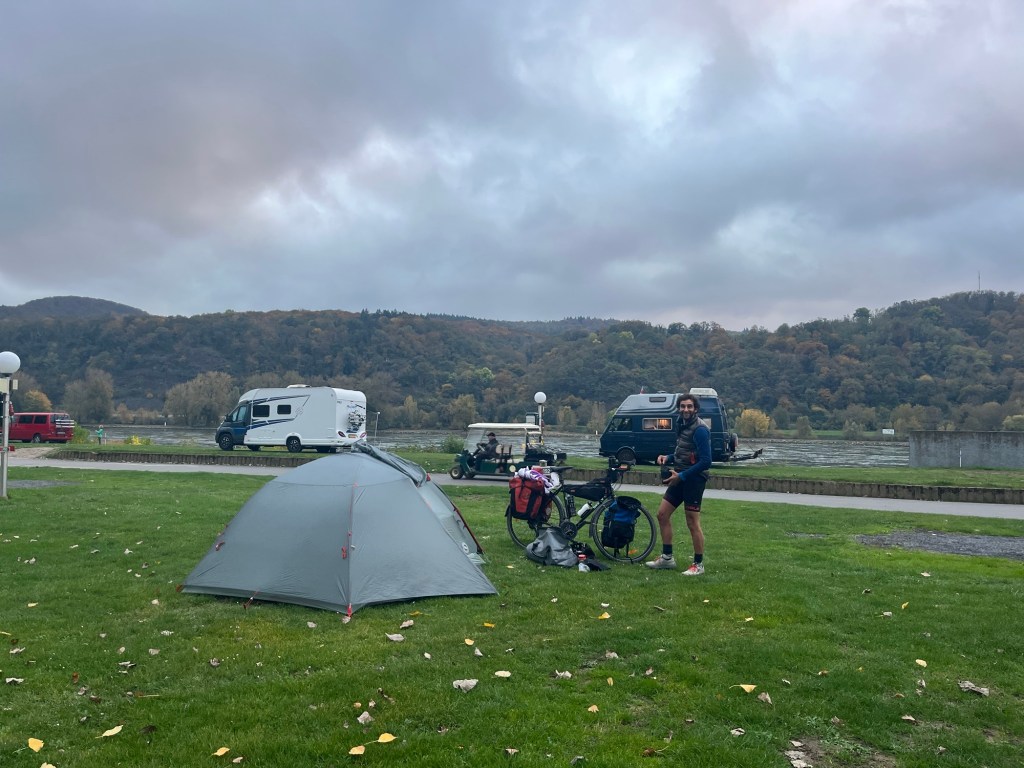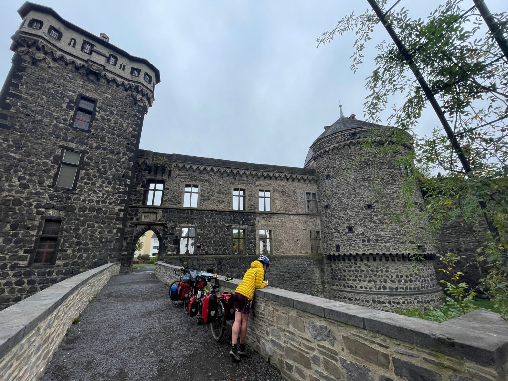 It was a nice interesting path with some variance and obstacles. We visited Andernach with its pretty fort like structure and felt very hungry. We crammed in mounds of peanut butter and bananas. It was a cold day without the Sun and we’d stupidly worn running socks which seemed like a good idea but it’s not. Your feet don’t do anything, so they get cold. The panniers are a good wind buffer but it’s not quite enough.