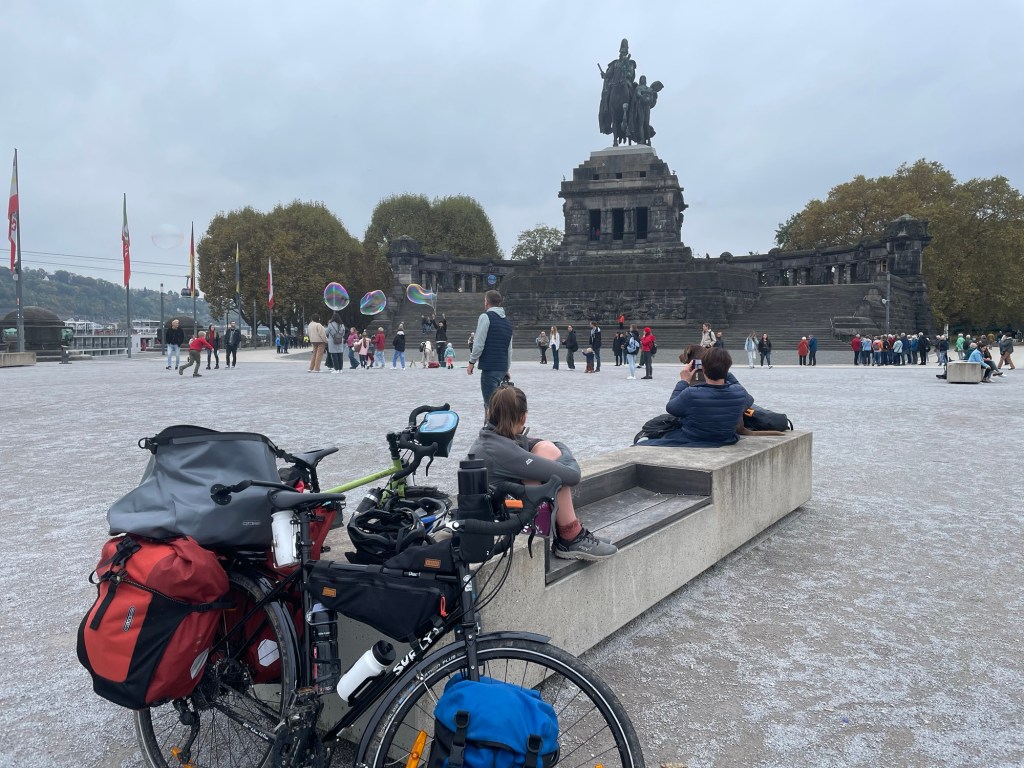 Koblenz was very scenic and a large monument dominates the view as you arrive. We wanted to have lunch by the statue anyway but the route took us that way. We had to cross a river though but not the Rhein. Koblenz marks the confluence with the Moselle. The statue of the emperor who united Germany guarding the point they join. It was a popular tourist destination and we enjoyed watching the visitors.