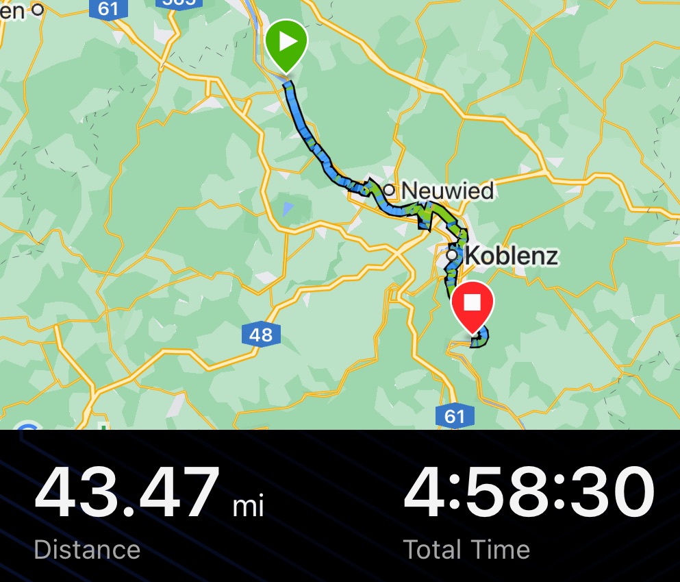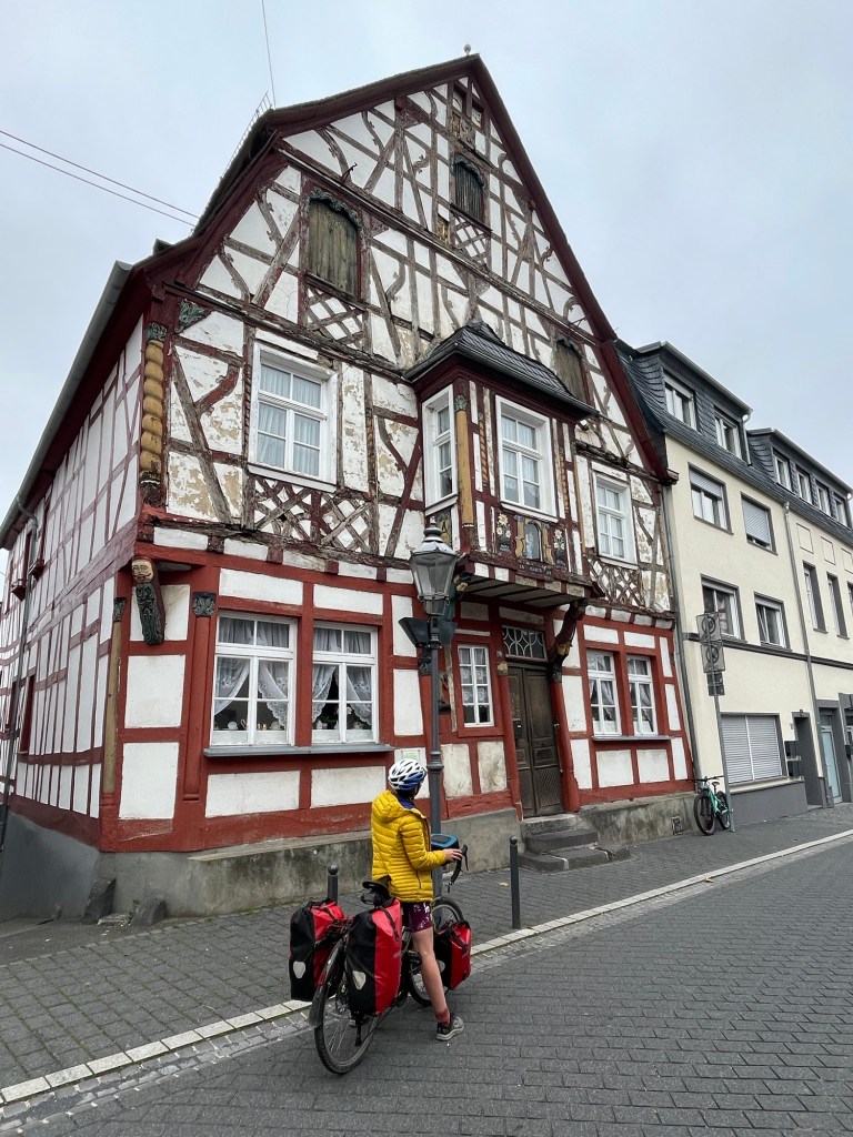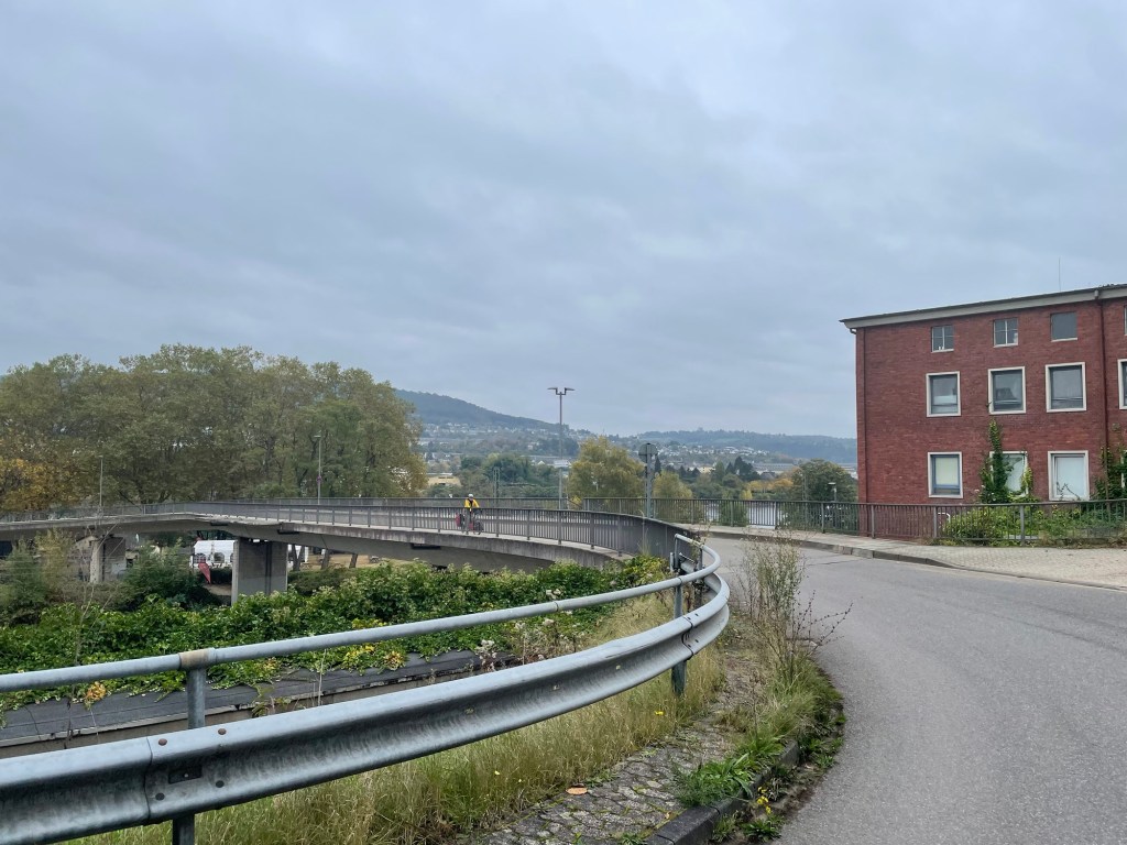 Leaving Koblenz was not nice and easy as it should have been. After a delightful journey past some majestic buildings and some obligatory, but in no way dissatisfying, time in the woods, we hit upon a blockage but without an obvious Umleitung. We were stuck between the river and a railway. We backtracked sufficiently to see a hidden yellow sign and started up the overpass to reach the road.