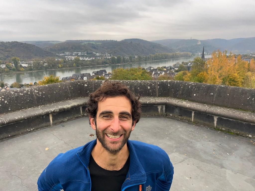 It was a little bit of a struggle to locate it as google either sent us up a daftly steep path which turned to rocks or what seemed like a very long round. The long way round ended up being the way to go. We managed to climb all the way up on the road, on was at least 10% in several places. No mean feat while fully loaded. The views were outstanding and well worth it. You could see for miles in both directions of the mighty Rhein.