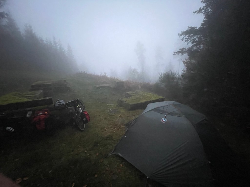 As the night had rolled on the clear skies had led to thick fog. When we were awoke there was far less visibility, though it was probably a lot warmer as a result. No one had paid a visit to this little relic and we felt safe waiting until the light came to dismantle the tent.