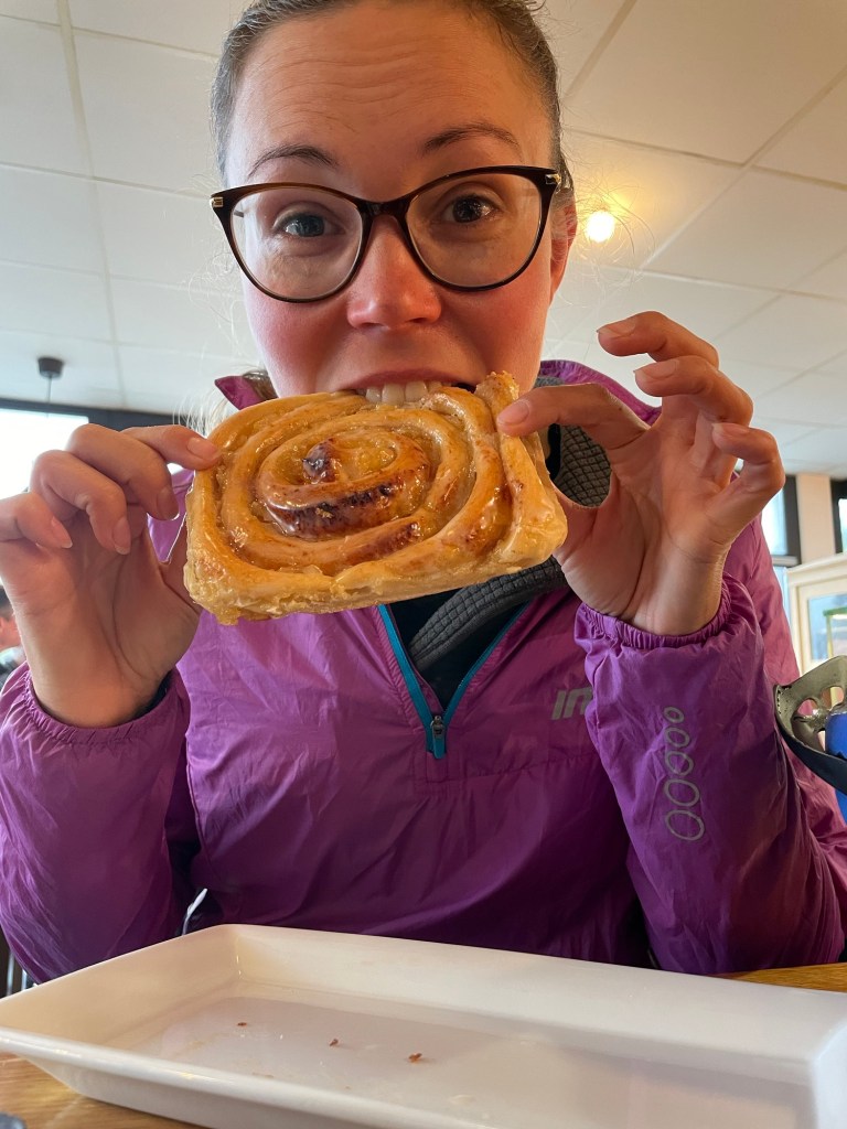 As we rode over the nearby tracks the cafe was bustling. People were clearly intrigued by our arrival, turning to look through the huge glass windows. Obviously we draw a little more attention but people like the idea of adventure. We were pleasantly surprised by the knowledge of the lady behind the counter. She immediately pointed out the apple pastry as vegan. We ordered two, and two large coffees. They even had oat milk on a dumb waiter.