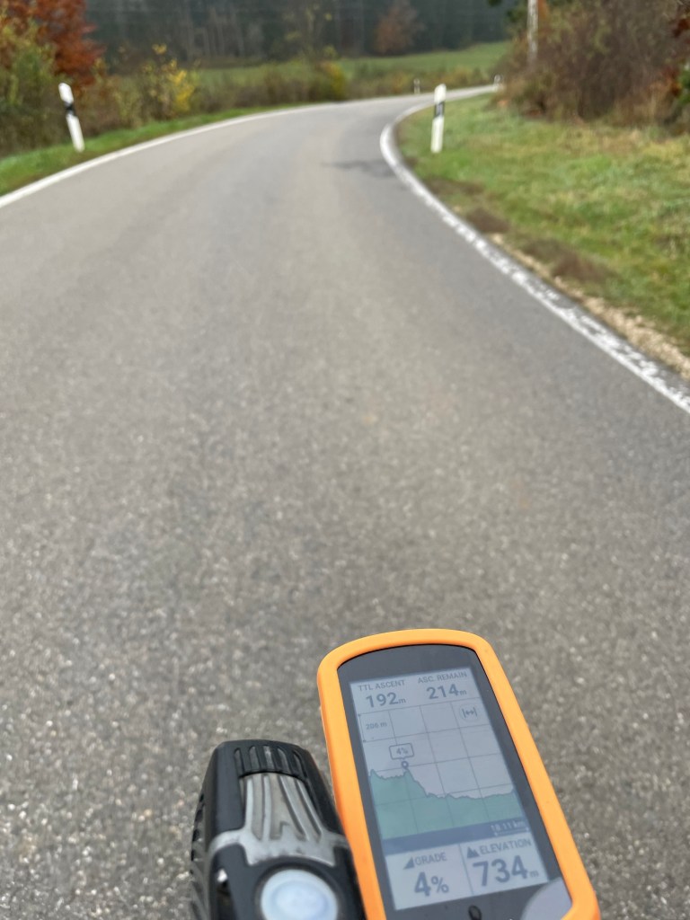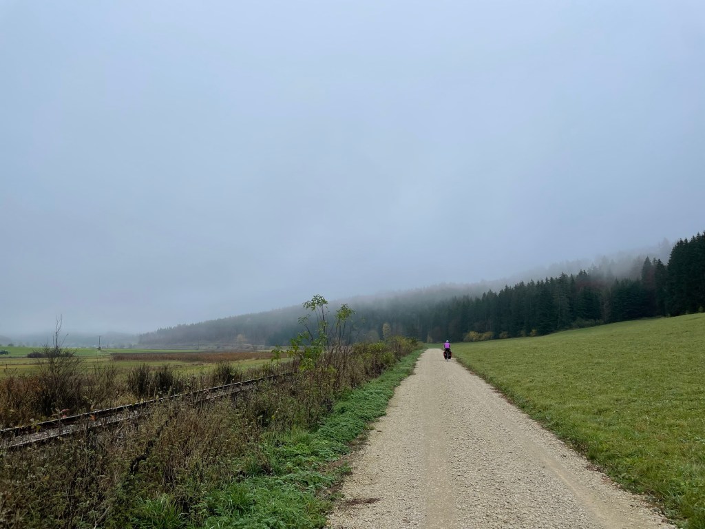 We were taking a longer route but safer as it was on official cycle paths. It took us down gentle gravel tracks and through farmland and woods. It was foggy though, and it wasn’t lifting. But we were thankful not to have rain. It was going to be a fun day too. We had been up on the hills for 2 days and now we were going to descend. We started going up though. There was one last beast of climb before we dropped off. The anticipation made it seem endless. Was the elevation graph wrong?