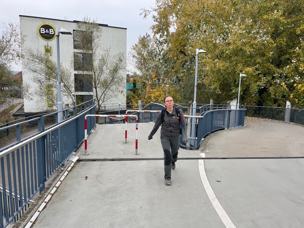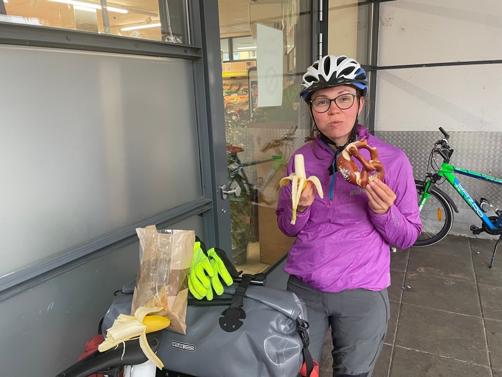 We really pushed through the miles. The path was easy in comparison to being in the forest. Our legs were sore but when it wasn’t hilly we were flying. We detoured to a Lidl in a town called Singen. There were several men outside on benches with an assortment of cans around them. The mood of the people felt like a reciprocation of the fog. We scoffed down a pretzel and a banana followed by 1.5 Apfelflockens (apple turnover) each.