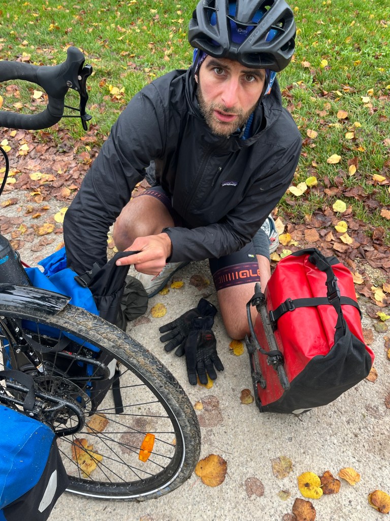 It wasn’t. Eventually we crested the top by a farm that had a solar farm with a sign that indicated it was part of the “solar offensive”. We stopped at a bench to take in the view. Shouldn’t really stop as you get cold but then why climb. A conundrum. We popped in some nuts and a cliff bar. Then clipped up the panniers ready to go but, oh no!