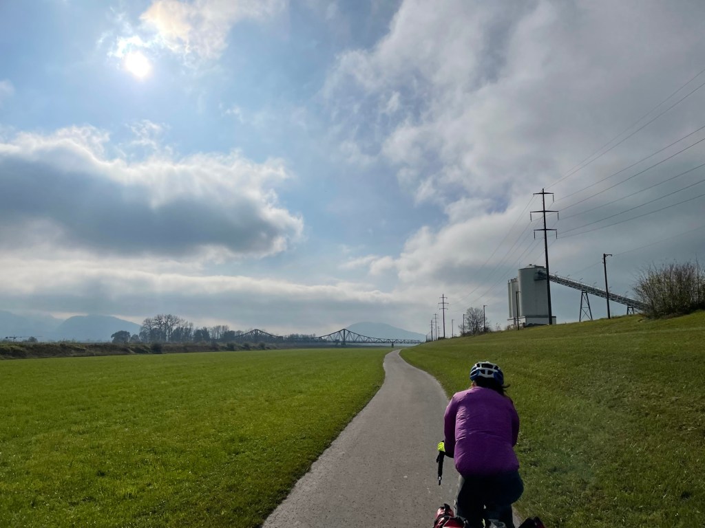 It started with lots of flat miles on the bank or just below, at first on gravel and then to make it even easier, tarmac. Our legs were grateful and we made swift progress though it wasn’t particularly scenic. The Rhein however looked beautiful despite its unnaturally straight path. Crisp blue water, glacial, flowing over pebbles and currents swirling it in unusual directions.