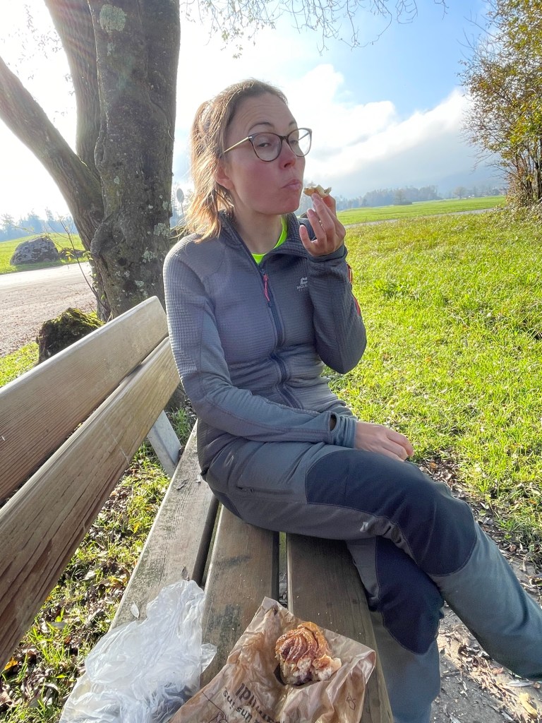 We left the river (and the noisy motorway) at one point and the route went towards some villages and their somewhat discombobulating backdrop of mountains that altered your sense of proportions. We stopped for lunch and wolfed down some cinnamon rolls too.