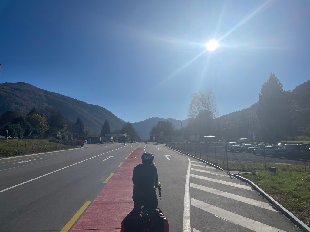 It was early and the pass was very busy. There is also a motorway and train line that traverse the gap but locals were definitely using this road a lot! It was a steep and consistent climb and for most of the way there was at least a suicide lane. You know, those dotted lines that say cycle path and drivers then think they should go as close as they like to you. An hour later we reached the top. Rolling down to bask in the sunshine, slip off the main road and eat breakfast. Some bread, peanut butter and agave syrup.