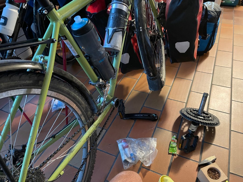 We were staying just off the route in the most affordable, and hopefully last, Swiss airbnb we could find. We’d got very used to the comfort of a bed and the places we’d been and routes we’d taken had not been tent favourable of late. Our accommodation even had a grand piano! The green surly had been creaking. We put it down to the bottom bracket needing tightening and set about a quick repair.