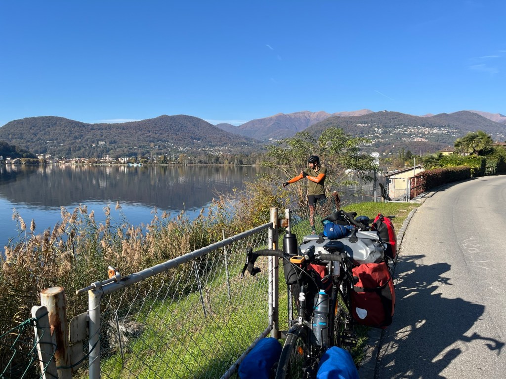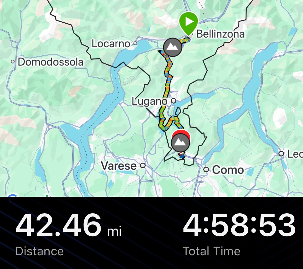 Once we’d got to Agno the journey improved considerably. We were taking a less crowded route around the southern tip of a piece of land that sticks into Lago di Lugano. Next to the lake we passed hundreds of fancy houses, often with outdoor lifts to take you down to their lakeside homes. Lots of MAMIL’s passed us greeting us with the now usual chorus of “ciao”.