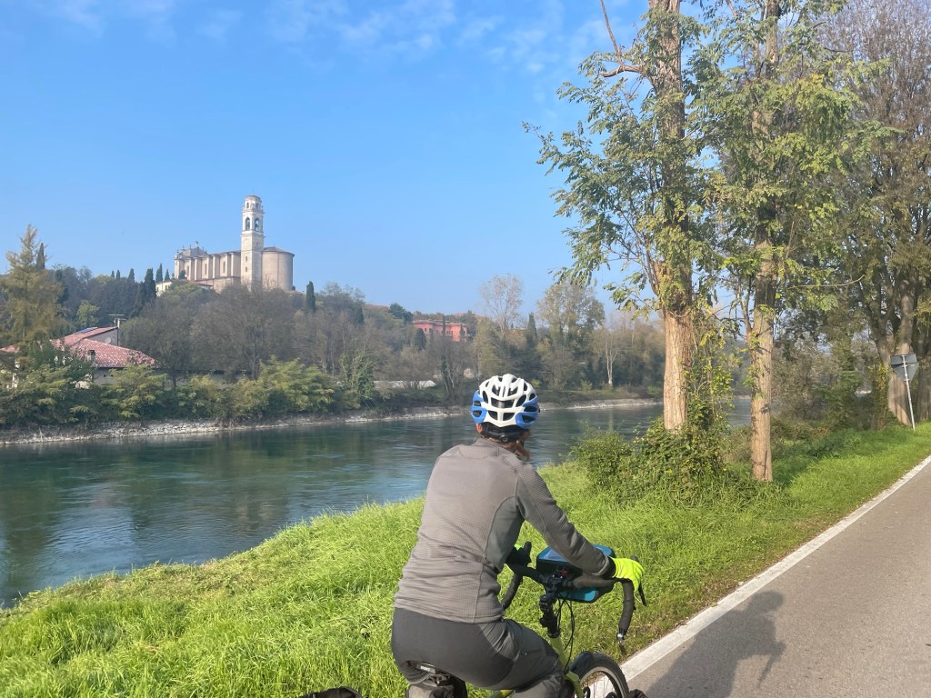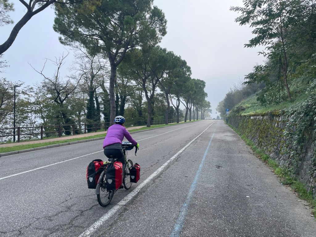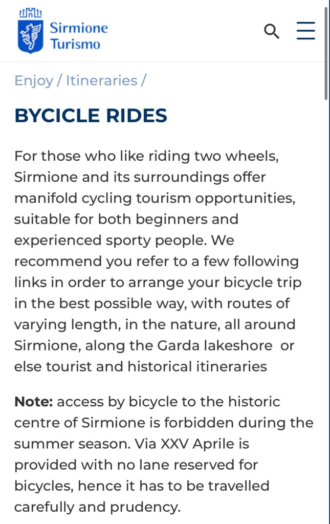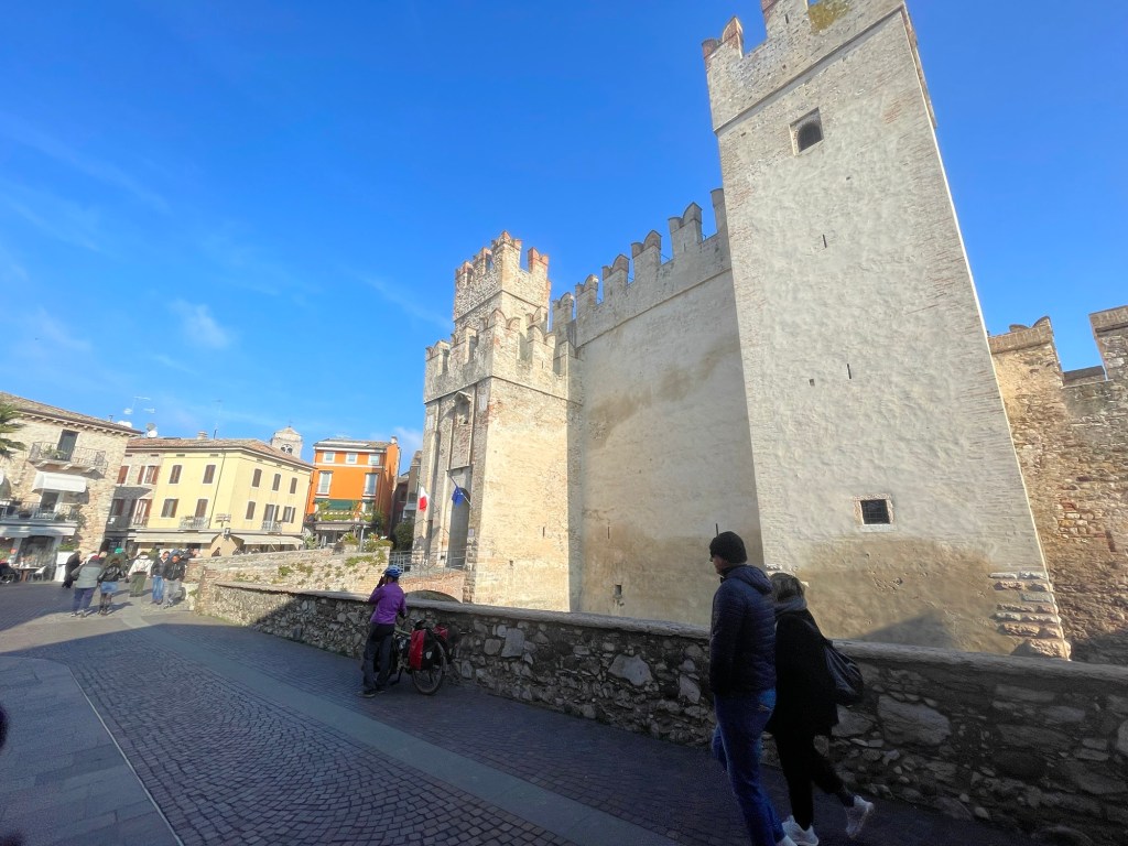 The peninsula of Sirmione sticks out into lake Garda. It has a wonderful Castello right at the tip, and we were keen to see it. It was 10 kilometres out and back but the weather had turned glorious of course and it wasn’t to be missed. Still struggling to find a sanctioned cycle path we then discovered an unprecedented number of no cycling signs on the paths. On the only road we were repeatedly pushed to the side by the vigorous Italian driving.