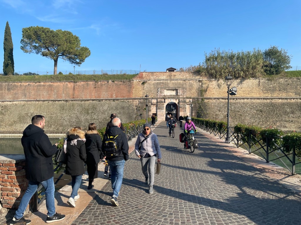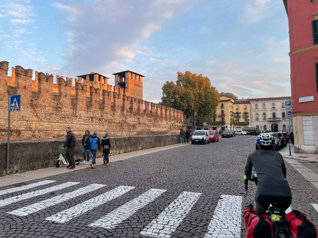 Arriving in Verona was pleasing indeed. The cycle route always took us through the most scenic parts of the cities and Verona was flush with big walls, turrets and an arena. We didn’t look too hard, we were to see the city in all its grandeur the next day. One of those large German Christmas markets that plague every city blocked our route, and our view of the impressive city walls, but fortunately it wasn’t hard to work around.