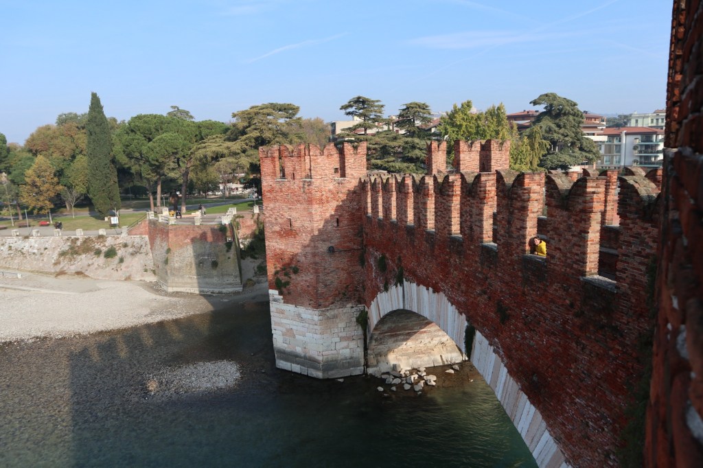 The castle was next up after passing through a hoarded Porte Bosari. Why it also needs a crappy advertising board, no one knows. Despite the Castelvecchio museum being closed, it was Monday and loads of things were shut, it was an amazing sight. The large walls and turrets carried on across the clear river, which flowed fast, as all the water does here. We were a little surprised to see how much the brickwork had deteriorated and wondered why it wasn’t repaired, there were sadly obvious signs of abuse by cement.