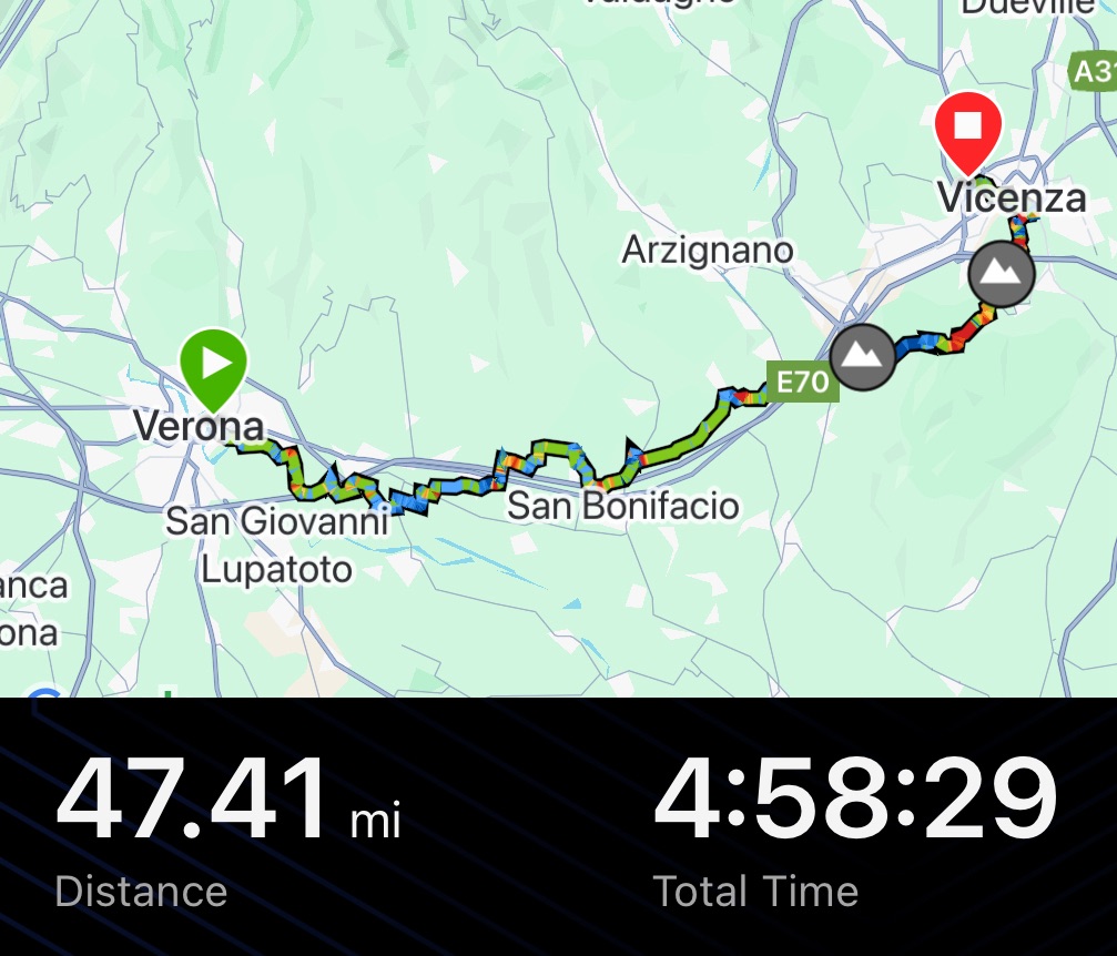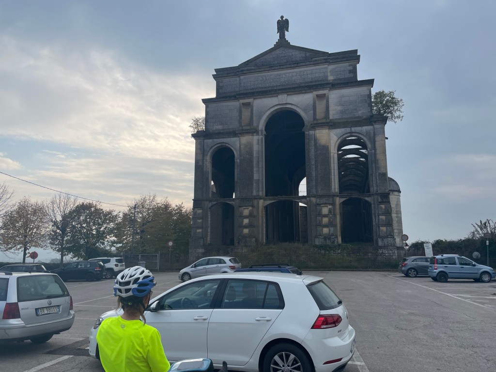 The vineyards were only interrupted by the hill we had to ascend into Vicenza. It was about 4km and 220m of elevation. We hadn’t had many interesting climbs for a while and this was to be a nice test of our lingering strength! It was a smooth and easy climb, punctuated by a beautiful hall of some kind that had been sadly left to deteriorate next to a car park. A puzzling waste of resources.