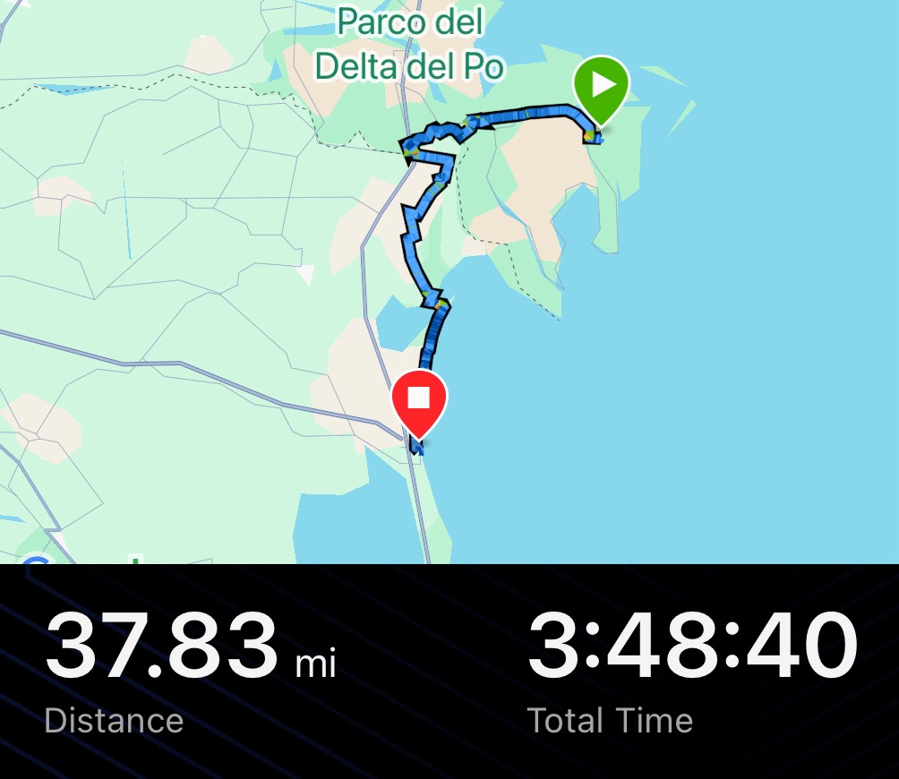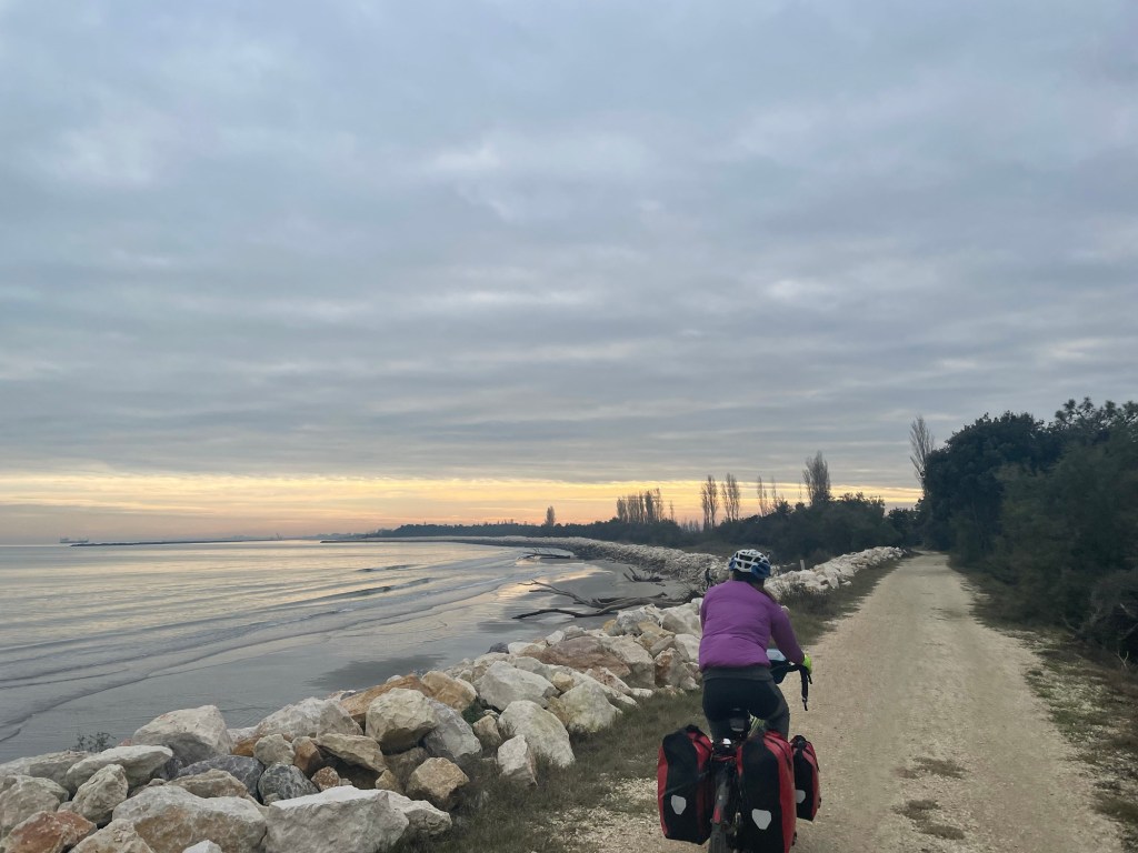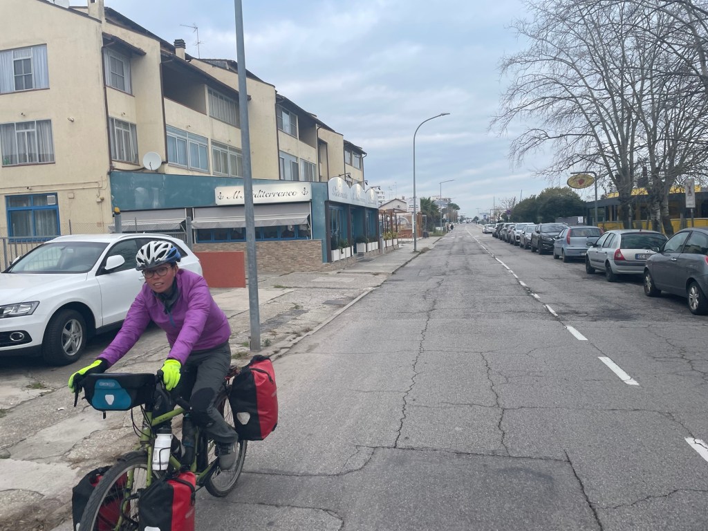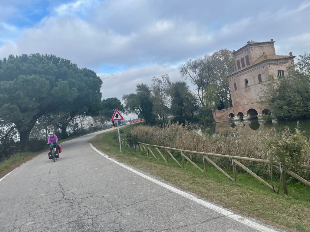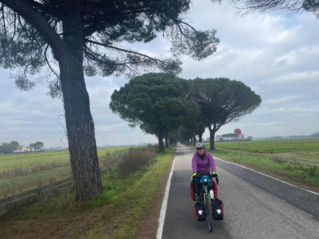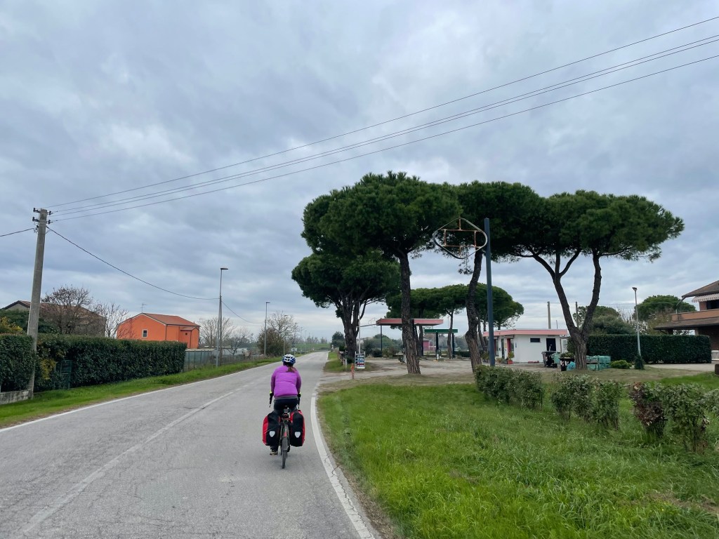 We were now heading back towards the sea and a lovely woodland along the coast called Pineta di Volano. We had initially planned to camp here, though in a moment of weakness, tired and cold, we relented to find a room in Porto Garibaldi. Yes, just like the biscuit. Fortunately, we were right to do so, the wood served up no places to camp, it being densely packed.