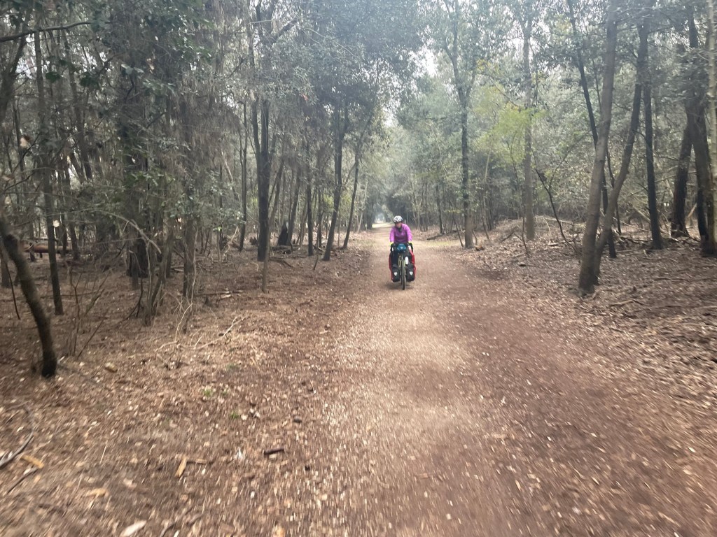 It was also densely packed with deer. There being so many, that looking in any direction yielded at least a 50% chance of seeing one or more. Sometimes they were seemingly frightened but mostly not at all bothered by our presence. It was a rather enjoyable few kilometres, punctuated by a track that was more difficult to find and equilibrium with. It did, however have glorious sea views, with an incredible reddy coloured sky in the distance, curiously it wasn’t anywhere near sunset yet. We guessed some kind of Saharan influence?