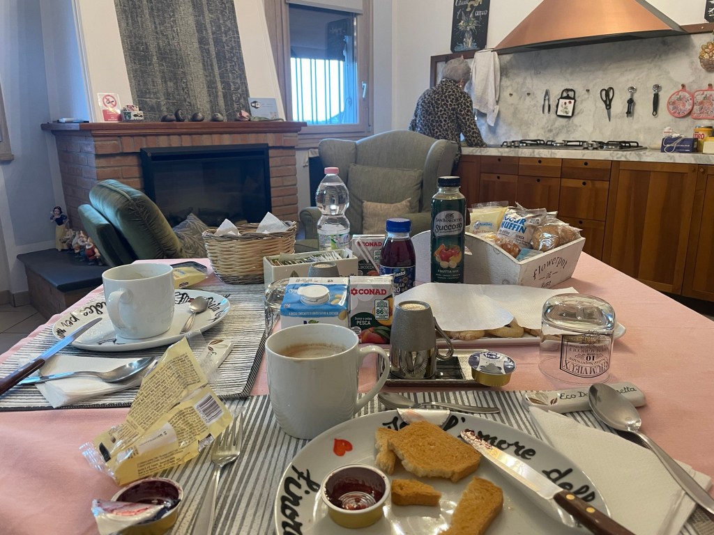 We should have had a very restful sleep alas Frankie found the early morning cockerel starting 4:30am to be disturbing, and Jonathan disliked the heat of the room. In Italy they’re all very keen on being very warm, all of the time.