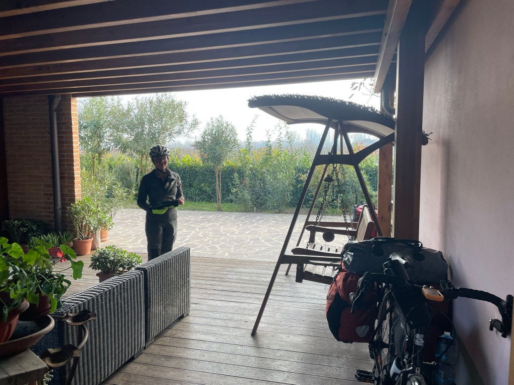 We headed off around half past ten, planning to rejoin the route in Faenza, a few kilometres away. We were cycling on what we presumed was the old road repurposed as the cycle path. A very busy road was on the other side of the hedge. There was a Decathlon in Faenza and needing to replace the disintegrated chain whip we thought it was best not to miss the opportunity. Interestingly, they only sold a new style of chain whip. It slots in between the teeth of one of the cogs, and has no chain flapping about that can break.