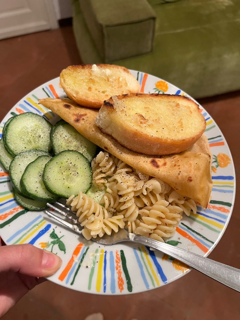 Soon they were gone and having not bought more food we cobbled together a tiny amount of pasta, some garlic bread and some pancakes. There was some cucumber too. As we sat on the sofa we realised just how long we would have to be in the tent when we managed to use it again. Apart from the deadweight we were carrying, it was also really expensive to