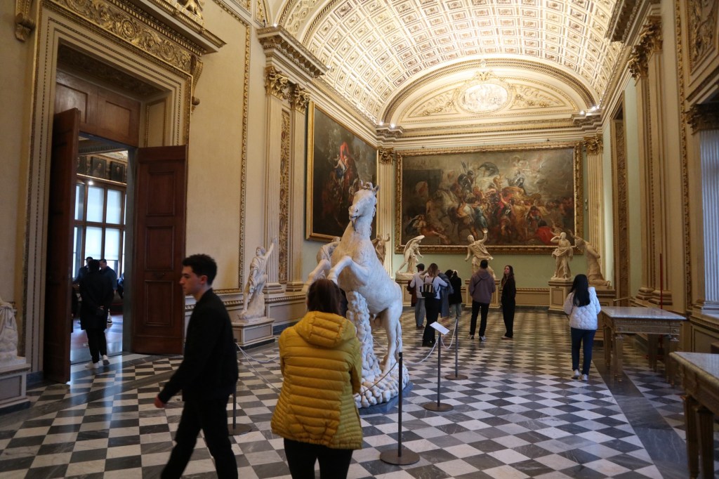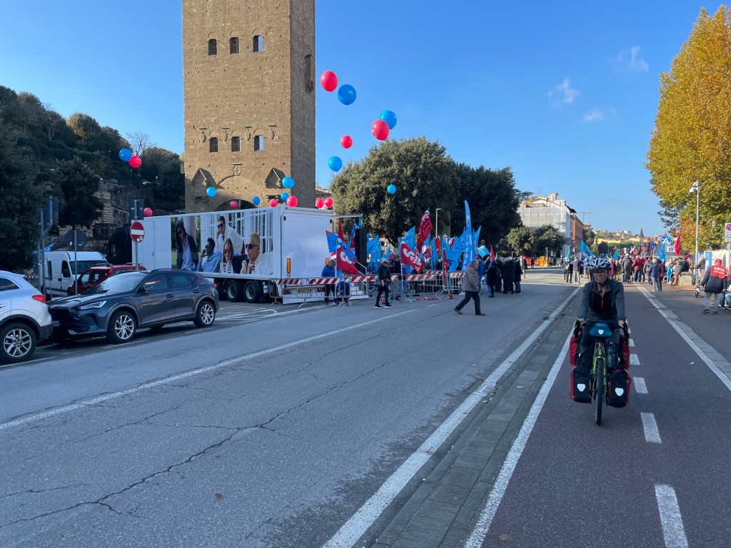 As we meandered jerkily through the people on Ponte Vecchio, we spotted a large number of colourful flags on the next bridge up the river. At the junction to the road in front of us there were police cars and further up police motorcycles. We trundled past as they were clearly waiting for the procession of marchers. We’d seen various references to the union strike taking place today for a few weeks.