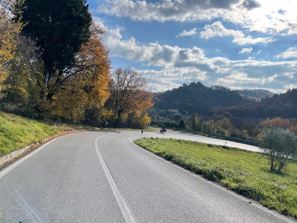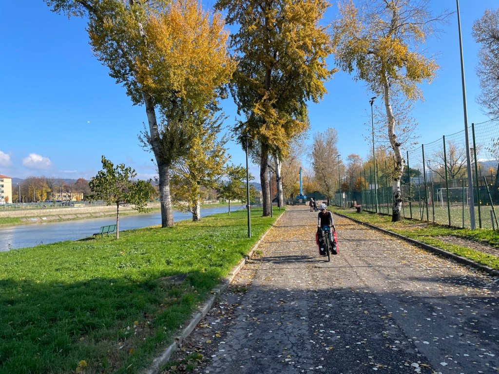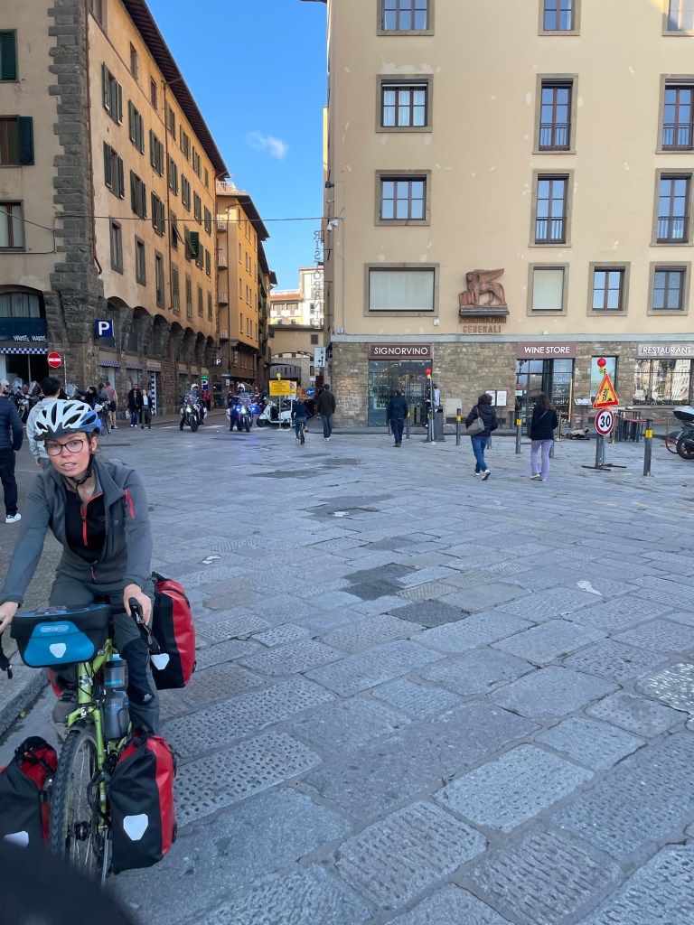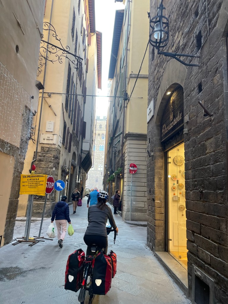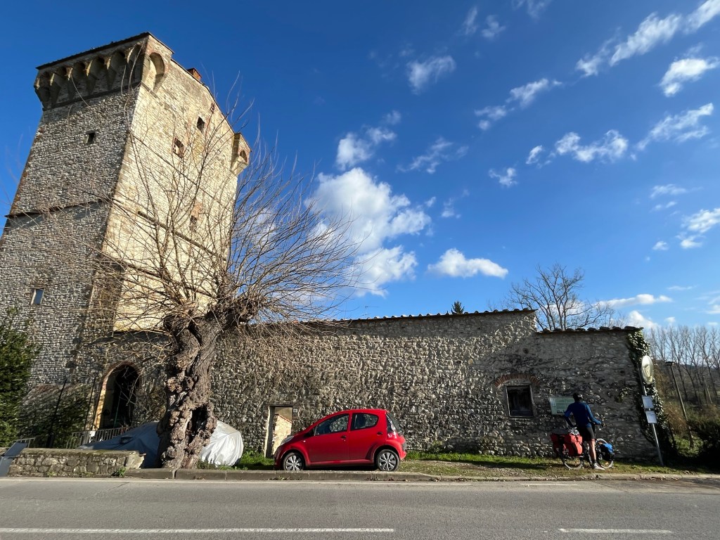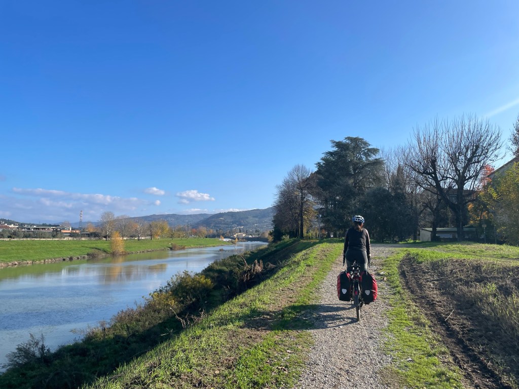 As we left Firenze heading east, we were on Eurovelo 7. A route that heads south to Rome. We passed more workers striking with large colourful flags and gave them a cheerful hello. Just after crossing a rather fiddly junction a friendly man in his late 60’s on a bicycle asked us about our journey. He seemed inspired, but we could sense his feeling of being unable to take such a trip. It’s sad that not everyone can have such an opportunity.