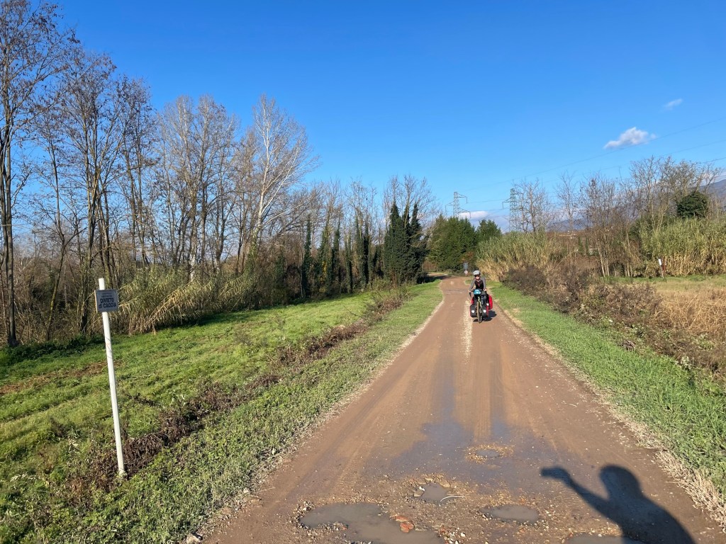 We followed the river east before hitting a blockade and a man nearby confirmed that the route was ‘chiuso ’, closed. Still, the way round was at least on a cycle path. We first rode through pretty suburbs where we assumed the more affluent lived, then we were suddenly on SP34. A busy, slightly undulating, road that we had to endure for about 5 miles.