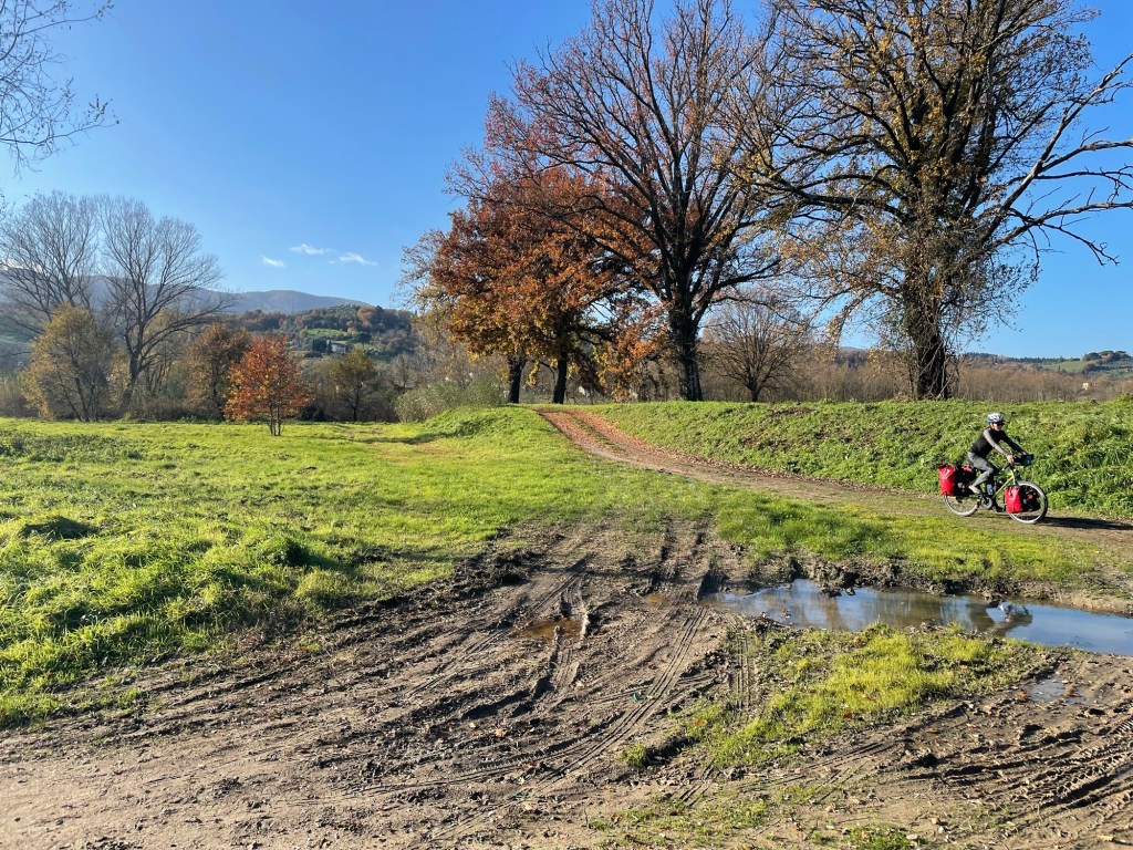 We were then to follow the Arno on a track, that worryingly started off extremely muddy and through what looked like a quarry. Afterwards it settled down a little bit but there’d clearly been some rain and we were navigating a lot of puddles. It was nice to be off the roads but it was slow going as we bumped along. Towards the end of this stretch we had to walk the bikes to traverse some deep puddles.