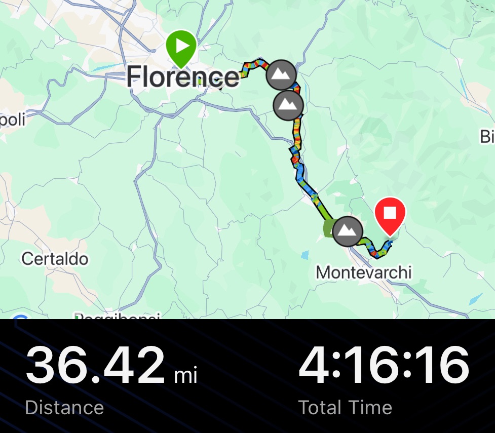 It was plain sailing until San Giovanni Valdarno where we left the river. We were using a mix of EV7 and Bicitalia, and expecting them, naively, to be the same. The route we had took us up an absurdly steep hill and then back down the other side, which we could easily have avoided using the road that ran parallel down below.