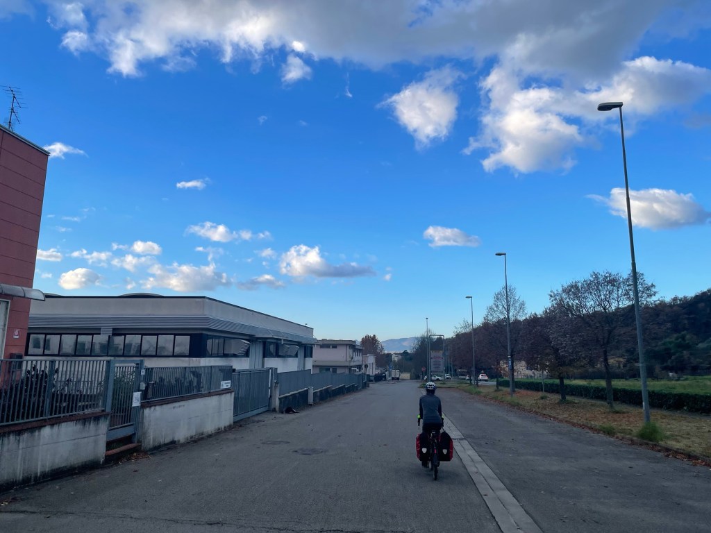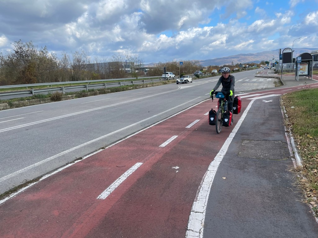 There’d been several signs the day before and they continued today. This was chianti country. The route went all the way into Arezzo, but it was possible to avoid it. Assuming that it was worth seeing we continued in. iIt was nice to find some cycling infrastructure, the road having got much busier in the last ten kilometres.
