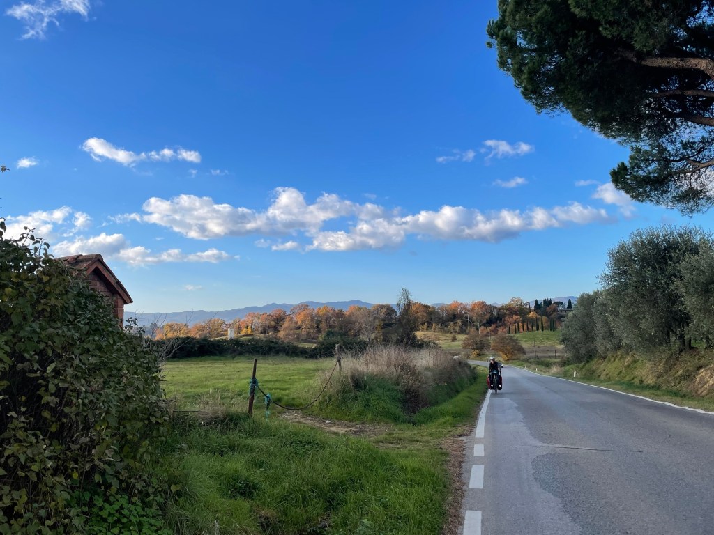 We’d decided to continue using the Bicitalia route as far as Arezzo, the next big town. As we climbed up the first hill to take the turning to Laterina, we passed some road works signs before reaching the turning at the top where it seemed to suggest we couldn’t go that way. We waved at a man driving past who promptly and kindly pulled over and got out to help us.
