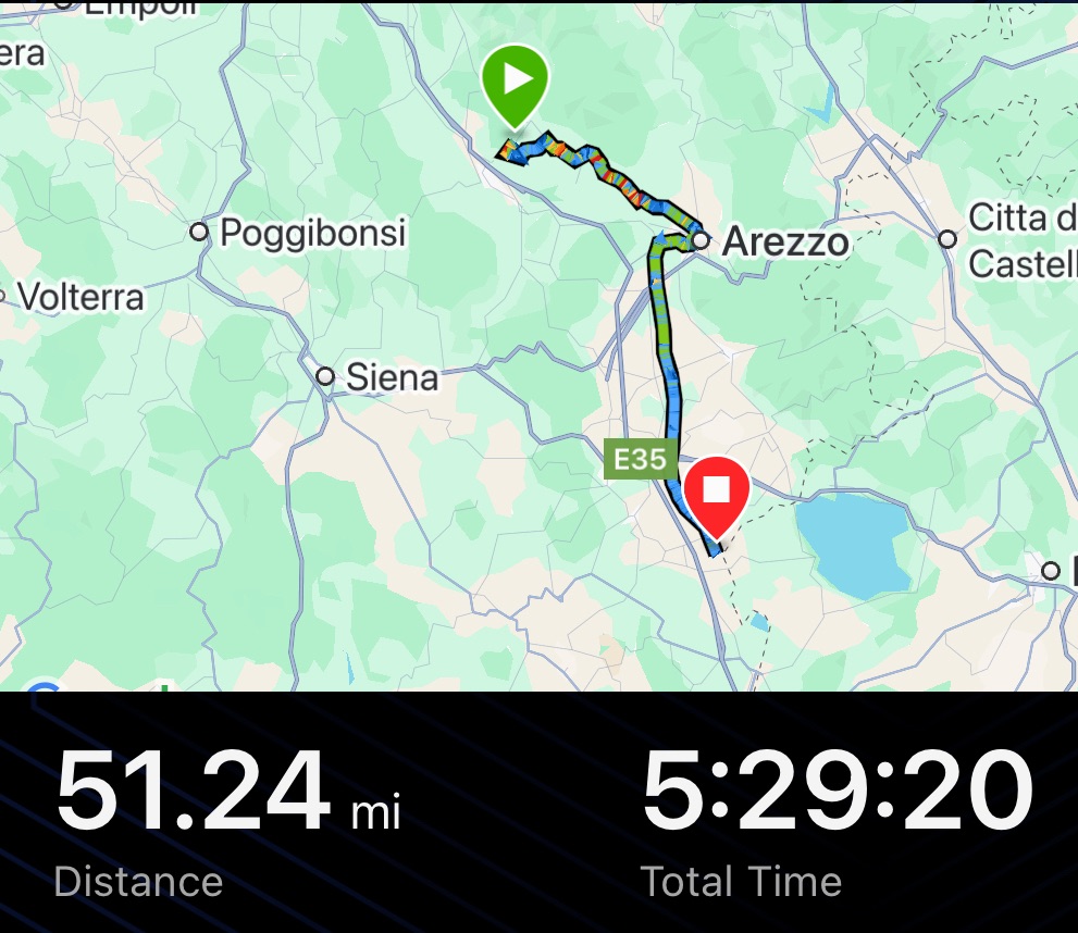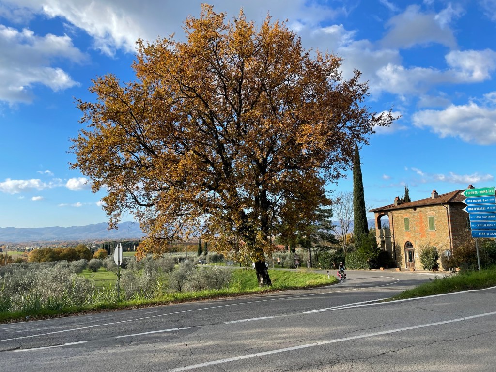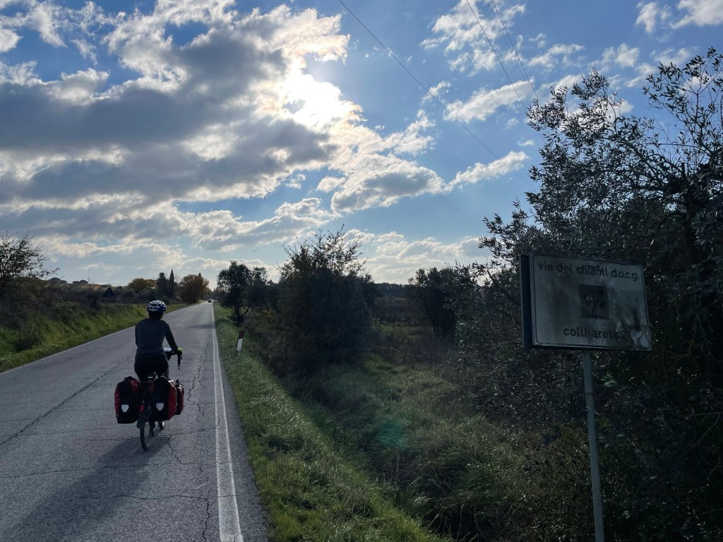It was difficult to translate what he was saying as we didn’t have any signal, but the gist seemed to be that we could go that way but we’d have to go down and up again. His hand gesture for hills was undeniable. Just then a group of cyclists came up the hill behind us, with one of them able to speak English. As we were headed to Arezzo, he told us to carry on the current road. It would go all the way there and, acquiescing with the driver, that it would be panoramic. They’d be going that way too.