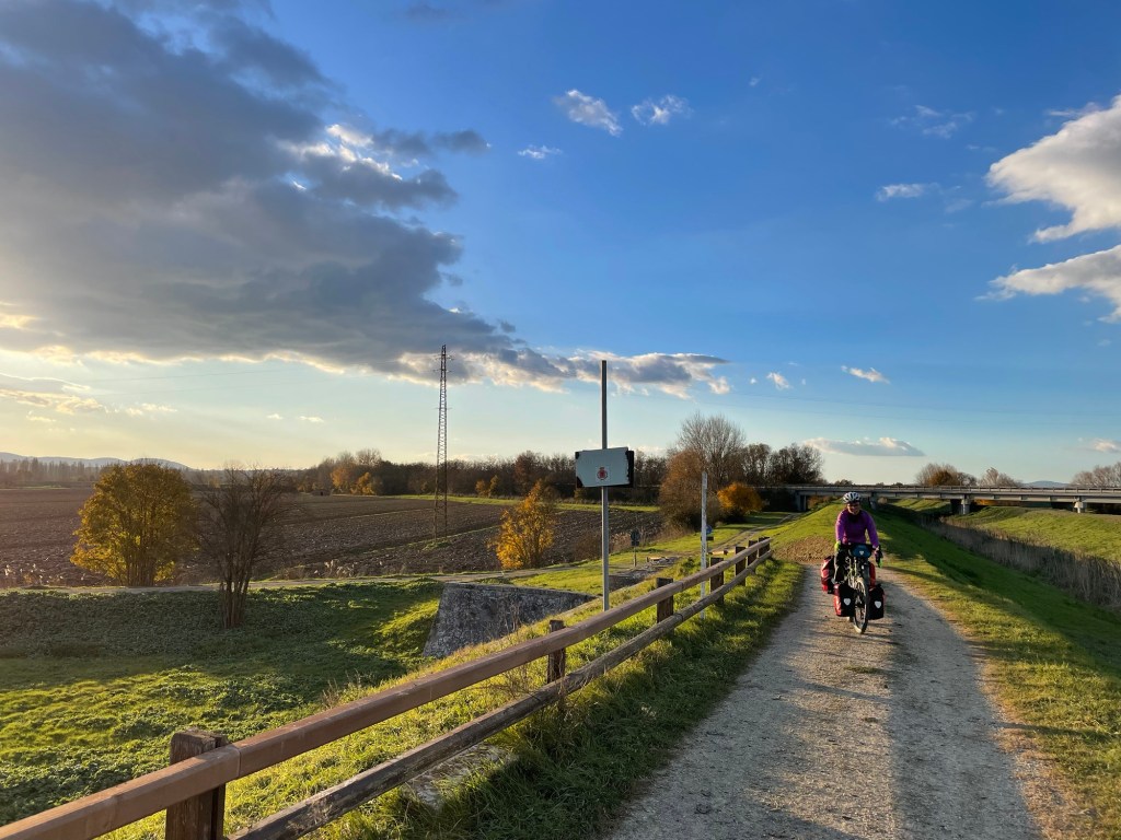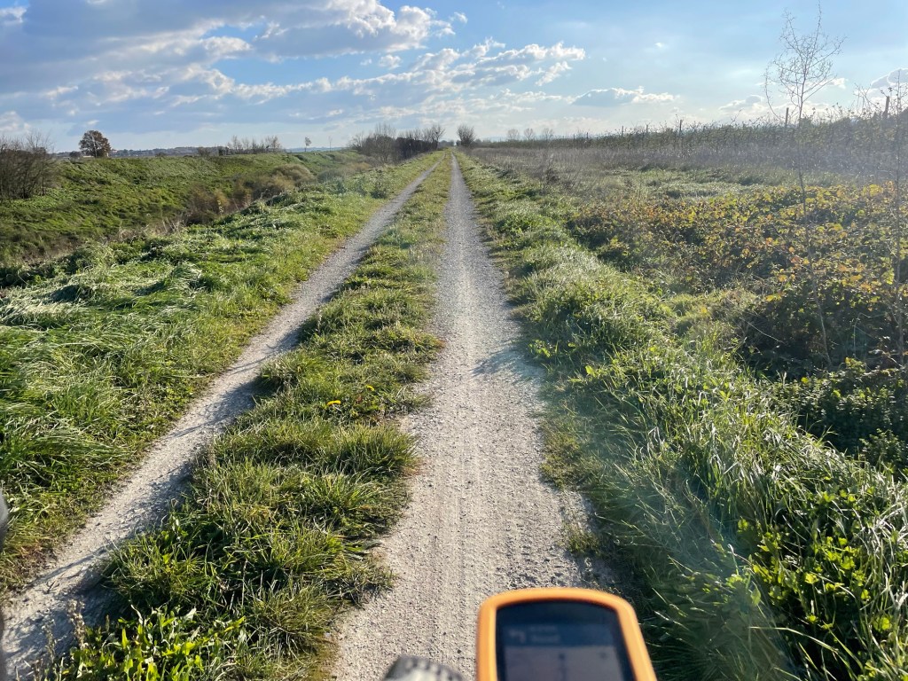 The path started as a light gravel track, and as we proclaimed the blissful lack of cars, of course one came straight towards us. Not long after however, we were onto the type of grassy middled track. Clear signs forbade the passage of cars and it was rougher and deeper gravel. The lack of any elevation was actually novel for us after so many days of hills and we powered along, the wind behind us and the Sun on our faces.