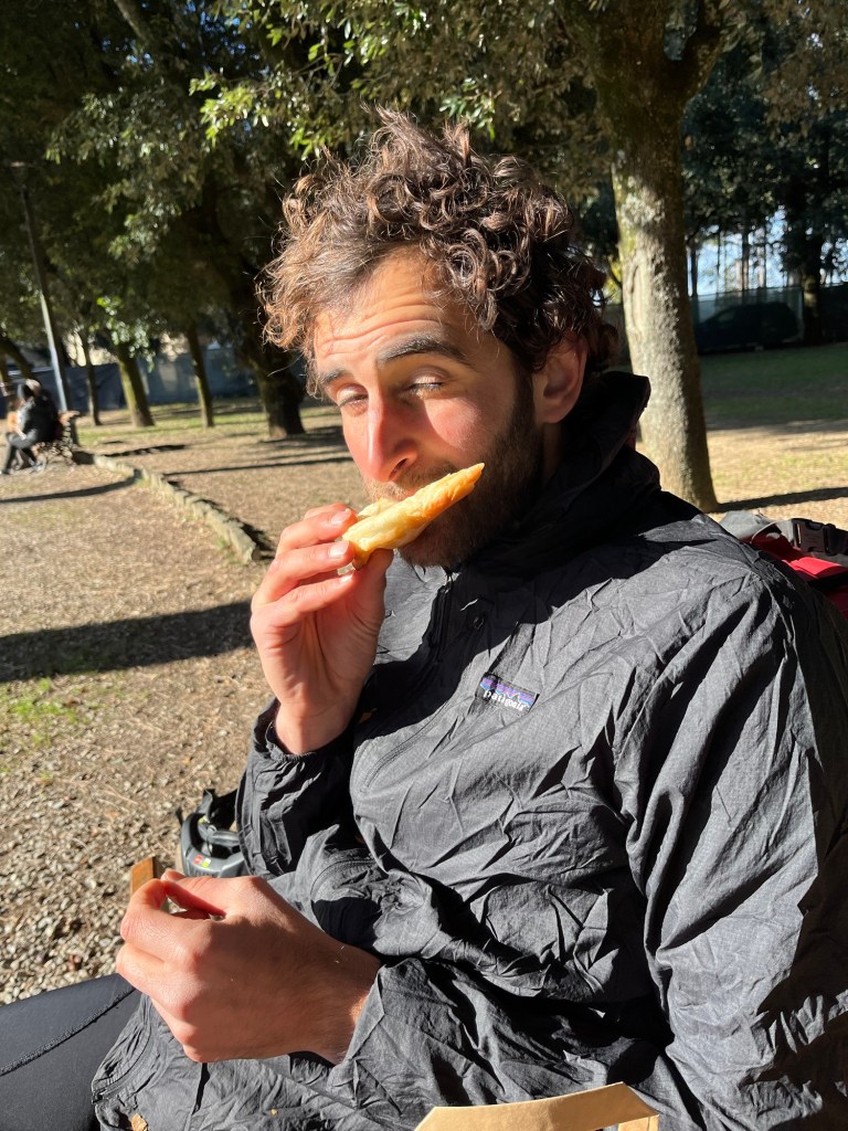 At the top of the hill was a park where we were going to have our lunch of bread, banana and peanut butter. At first glance there was another generic German market but as we walked round to take a picture of the incredible vista through the trees we saw a stall that had ‘Vegano’ printed in big letters. They had an assortment of different pastry goods both ‘salat’ e ‘dolci’, savoury and sweet, including the elusive vegan dolci cannoli!