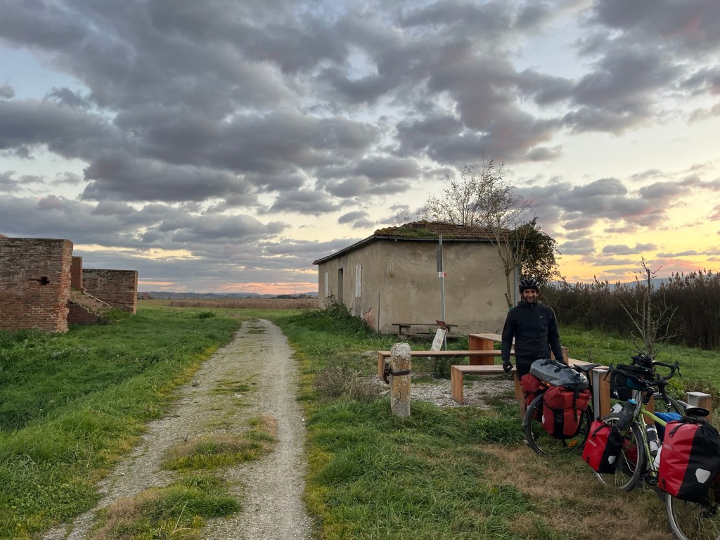 We stocked up and sat on a bench in the Sun enjoying the food. Afterwards, we found a descent from the city that avoided the market and began heading west. We were on excellent cycle paths, this being a developed part of the route called Sentiero della Bonifica. After popping to a supermarket at the start of the route, it was sixty something kilometres of wonderful dirt track next to the Canale Maestro della Chiana, Maestro being Master of course. The path was completely flat and was an examination of the drainage of the land.