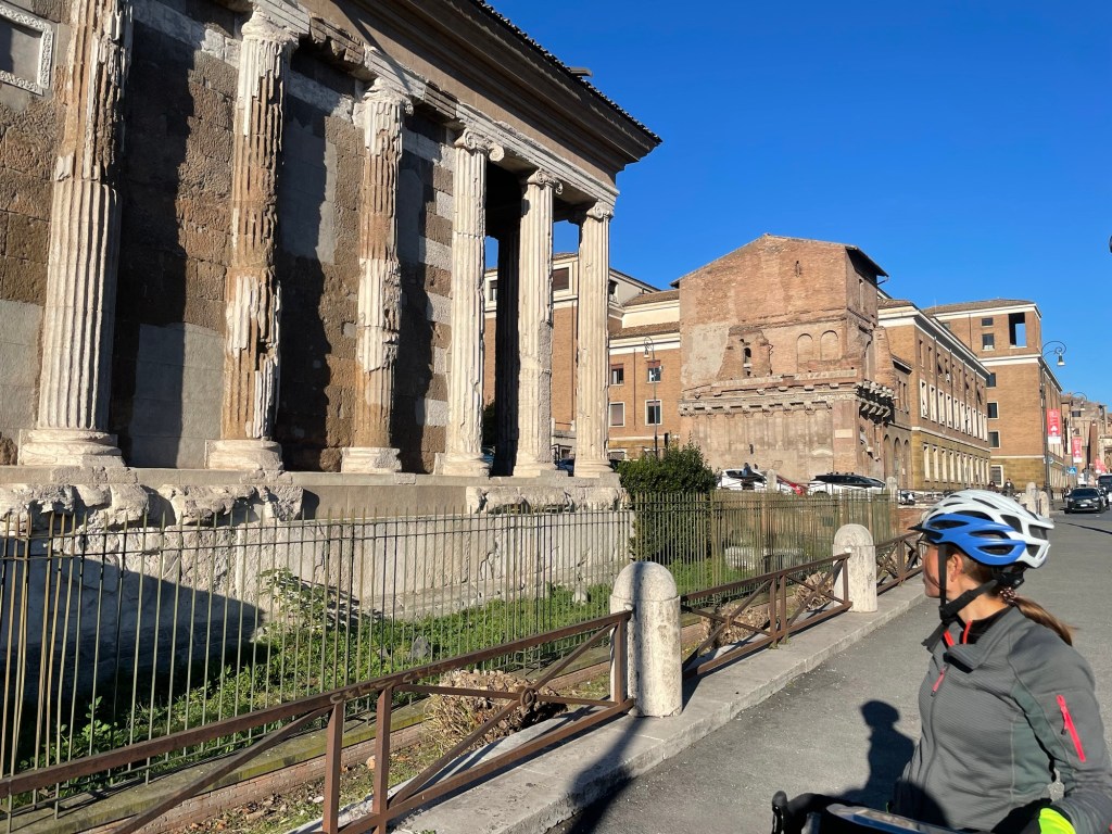 There were hoardings blocking all the entrances and exits but down below the barriers had been forcibly moved. Presumably these ‘works’ are taking their time. We gave up and cycled on the pavement in the correct direction. We ended up crossing the river early, walking the bikes up a one way street past a temple, and then joining a cycle path at Circus Maximus. They were putting an ice rink in some of it, but it’s the remains of a huge arena.