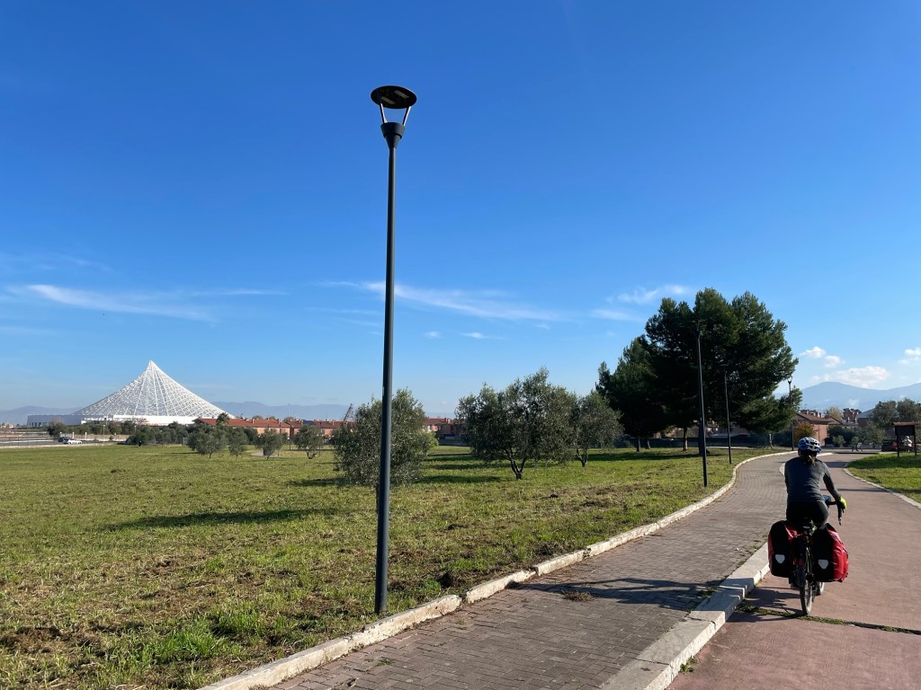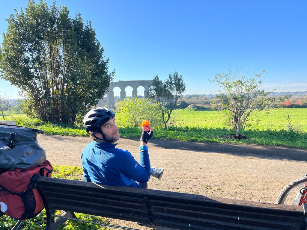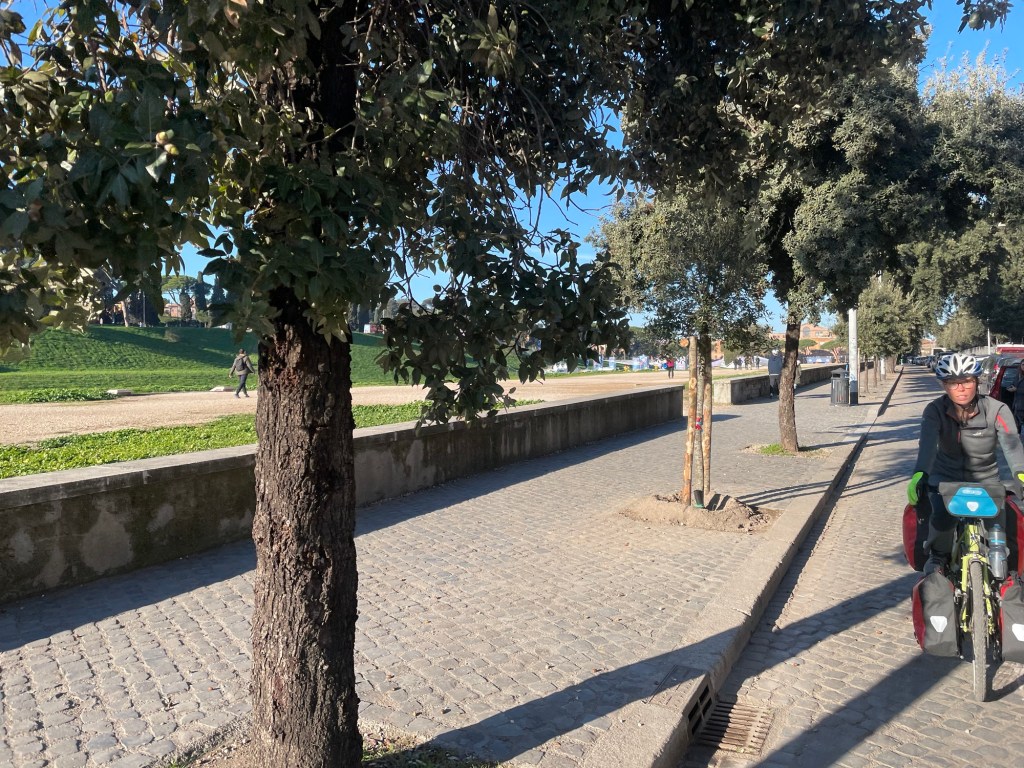 After a short while we left the jolting cobbled road to enter a large park on a dirt track where there were numerous runners. There was a gap to the next park bridged by city streets, and we were then riding next to the remains of not one but two aqueducts in the aptly named Parco degli Acquedotti. The Sun was powering down on us and we gladly sat on a bench to contemplate the meaning of life. Leaving Roma still left us with a large swathe of Italy still left to cover.