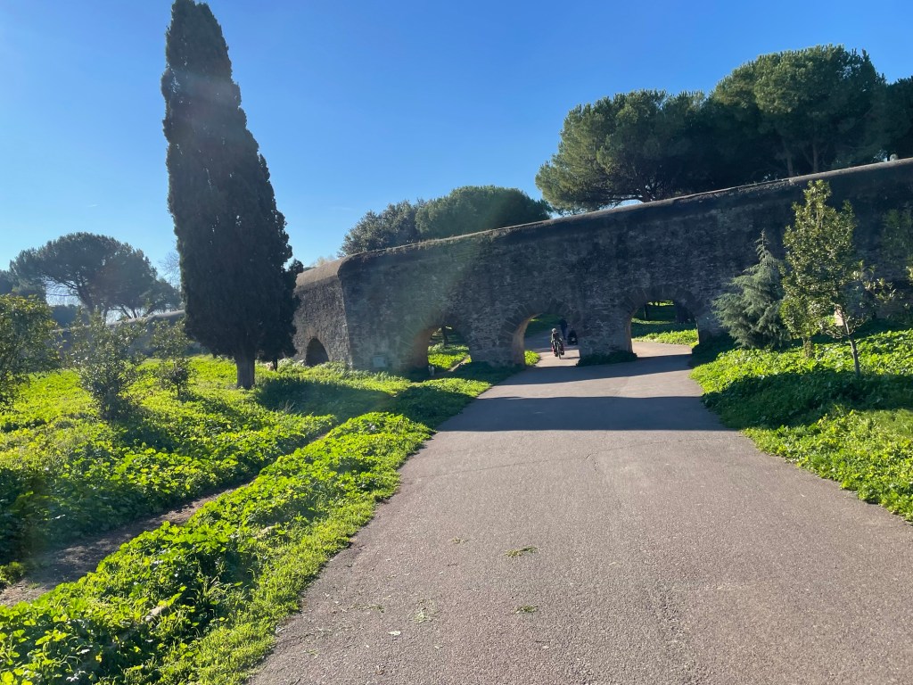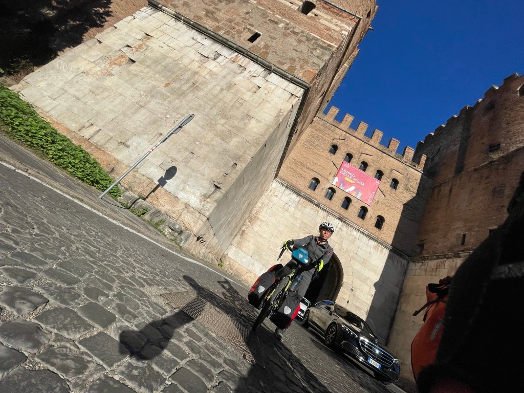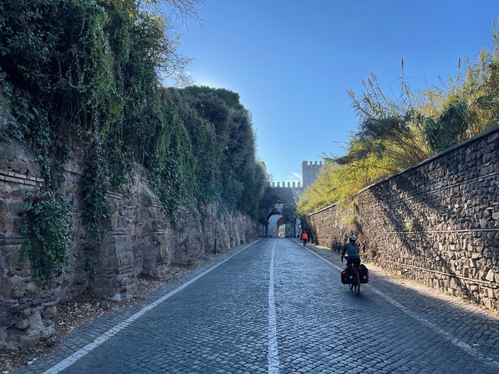 We were pleased to be seeing so many additional parts of ancient Roma. We rode past the remains of the baths of Caracalla and onto a cobbled street. The cobbles continued for a while, and took us past numerous interesting buildings. You could explore Roma for weeks it seemed. We passed through an impressive Porta in the Aurelian walls and onto the cobbles of Via Appia Antica.
