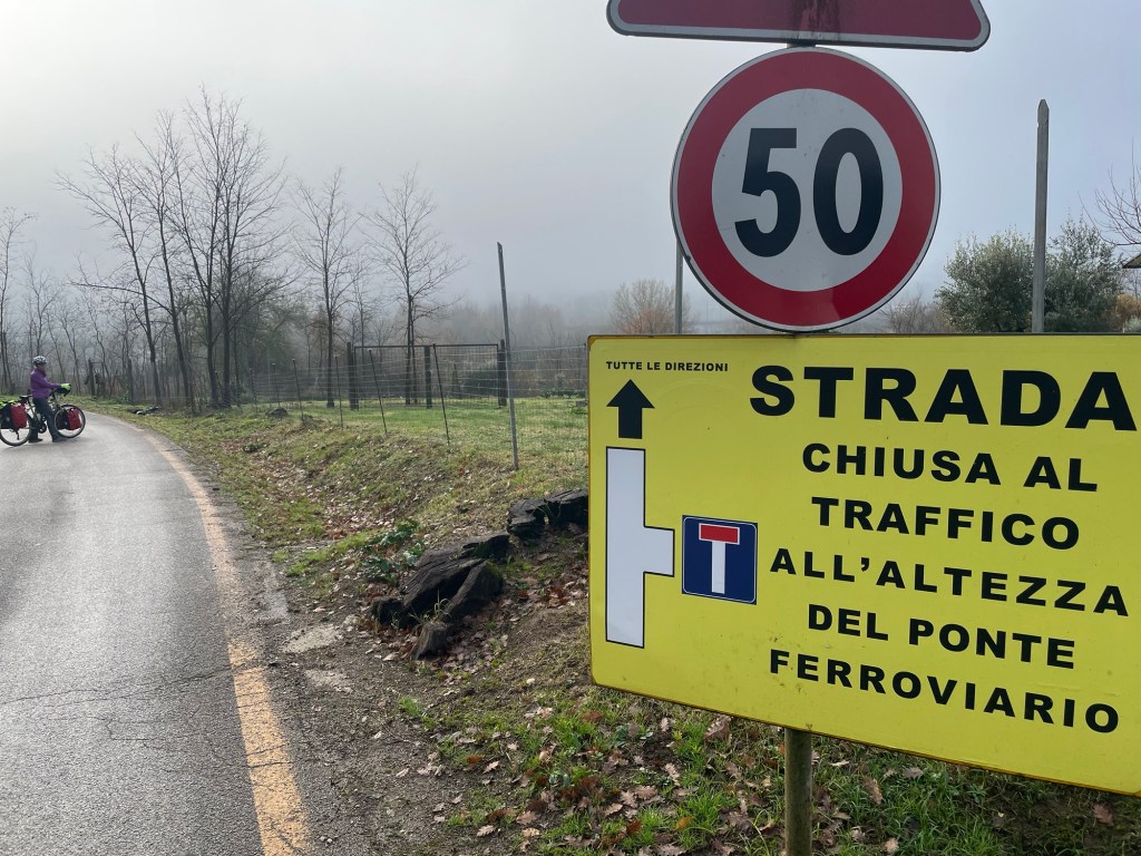 We left the old tyre in the garage and hoped it would be useful for someone else in the future. About a hundred metres down the road we came across a sign telling us the road was closed at the turning we were supposed to take. It wasn’t a fake closure either, the bridge, like every bridge in Italy, was being repaired and it was impassable.