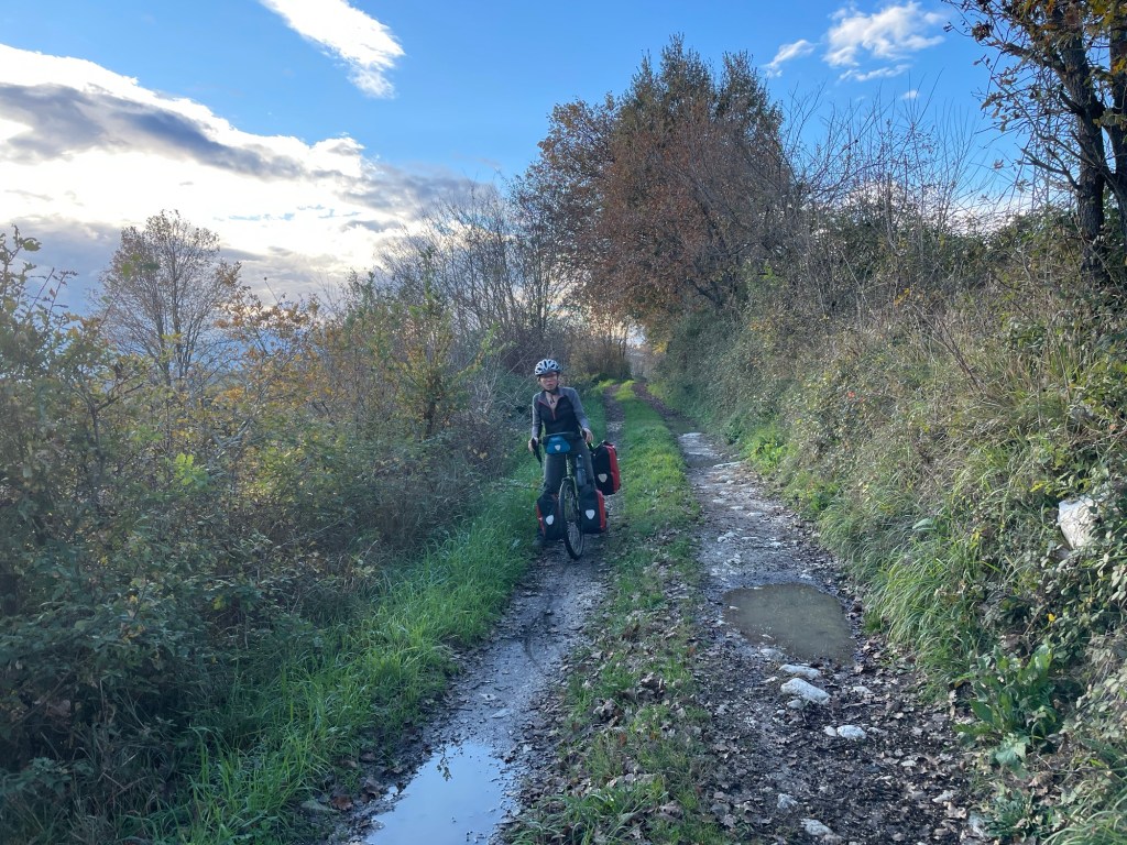 To our north was the main road, the SS6, but we were on a small road that passed through Taverne Vecchie. Then there was a left turn down an unpaved gravel track. We were a mere mile from the start of the climb and told ourselves it couldn’t last long as we walked down a very rough path and cycled through muddy puddles. After a few hundred metres the path crossed a road and we were very close to crossing the SS6. But the track deteriorated quickly into impassably deep puddles. We turned around, and headed to the SS6.