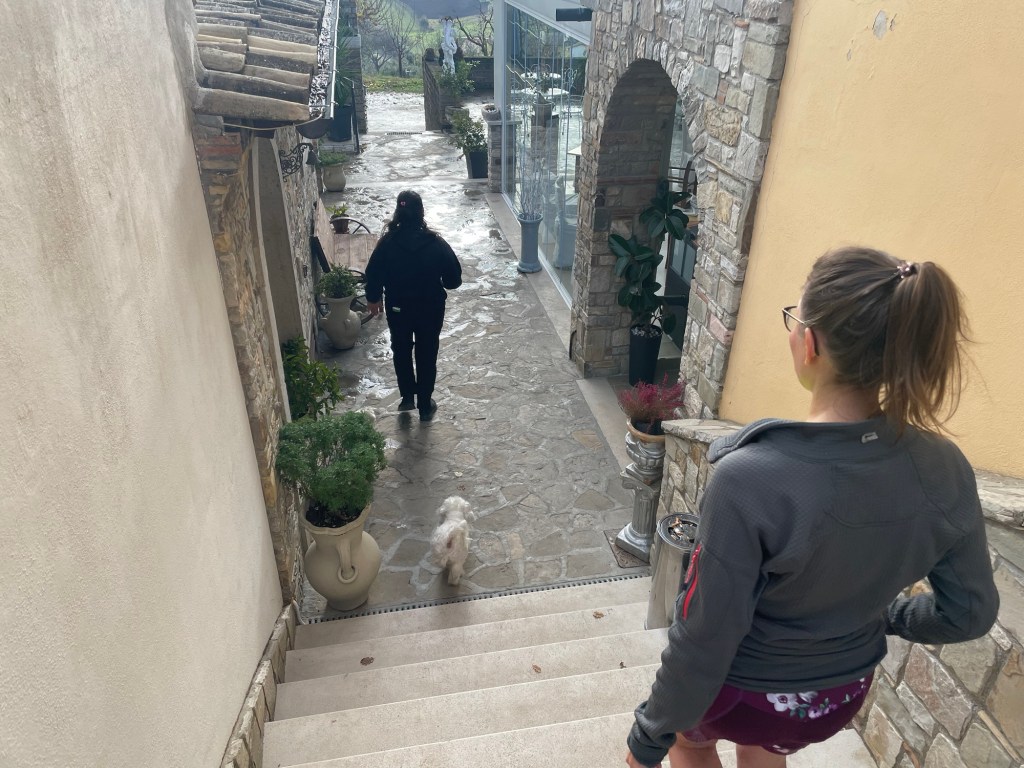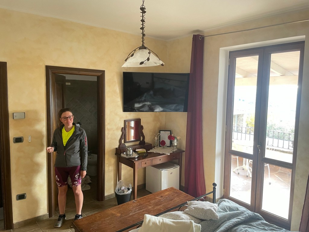 A few minutes later she appeared, speaking Italian very quickly, even after we’d made it clear we couldn’t follow what she was saying and showed us a safe space outside to leave our bikes before leading us to the room. She’d evidently just finished cleaning it as the floor still had a film of water from being mopped. It turned out she was keen to go out quickly, hence her fast speaking. We managed to get a pot of hot water, for some tea, before she left.