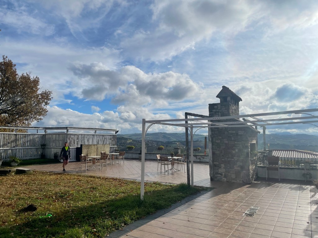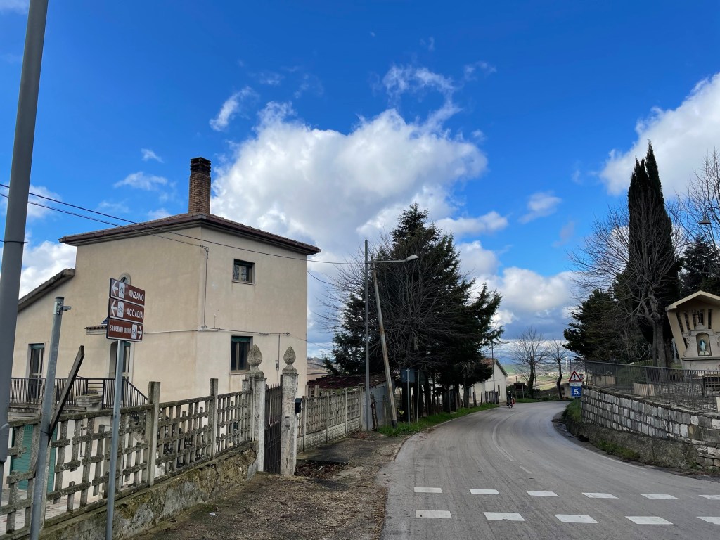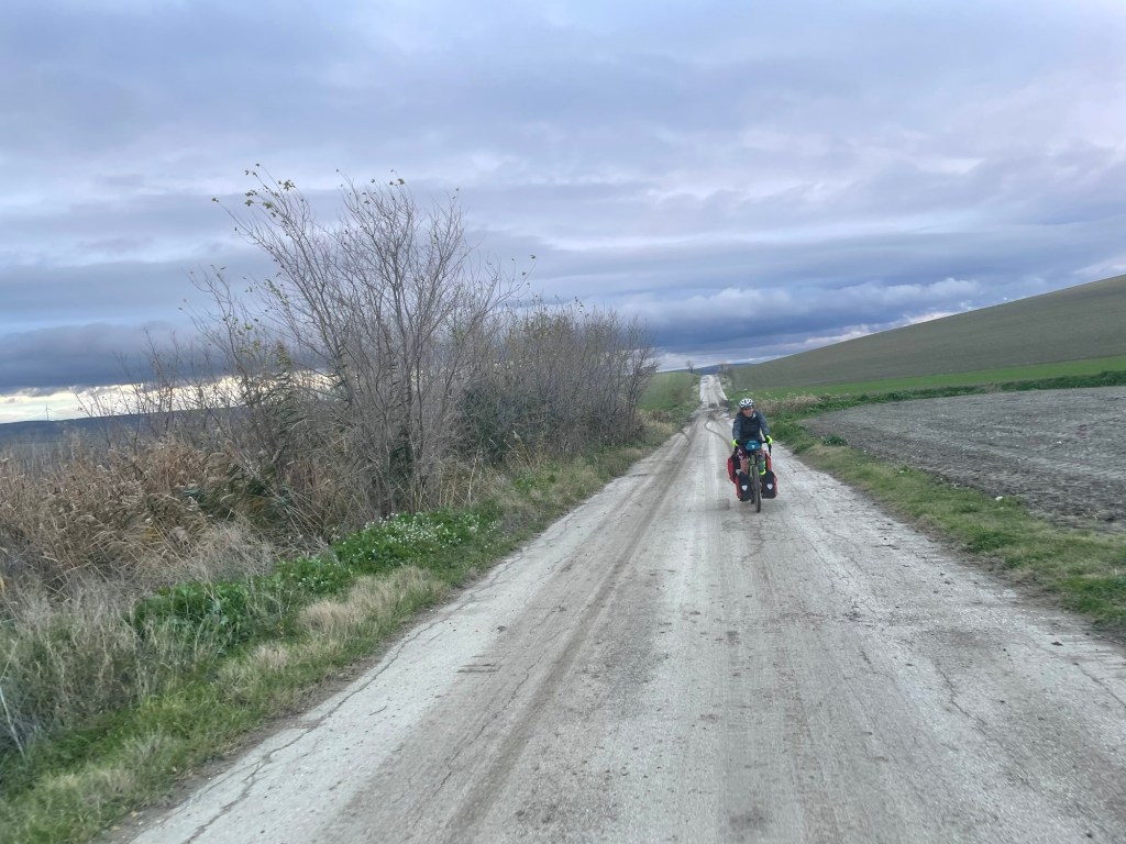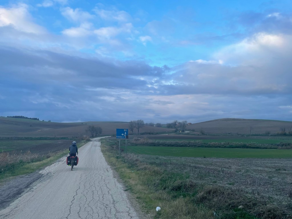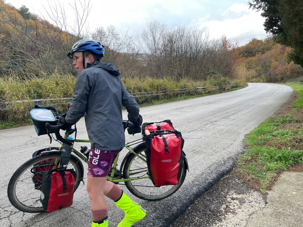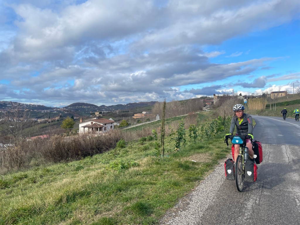 We hadn’t set a target destination for the day yet, although the elevation was going to be much less, we’d still need to cover a little bit. There would also be quite a lot of descent as we finished our final crossing of the Apennines. We started out on the road, under partly sunny skies, and saw several Sunday cyclists. Our weary legs found the climbs difficult, and we headed up to the highest point we’d been to, over 800m, for a long time. We rode through a hamlet, where a friendly couple praised us for cycling by gesturing towards their legs.