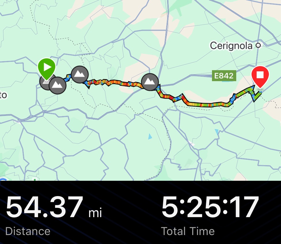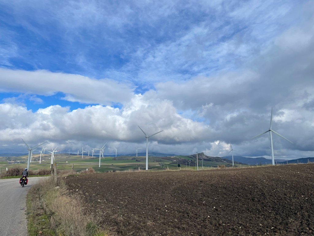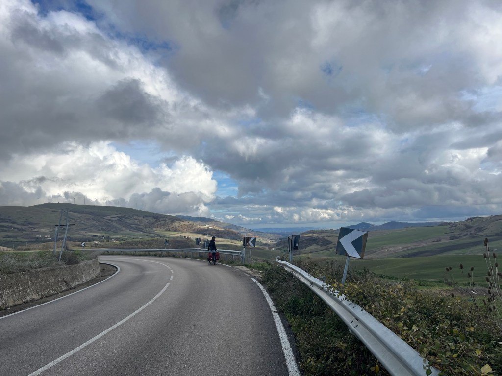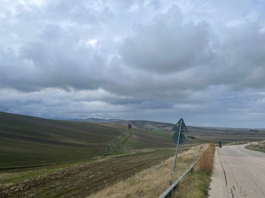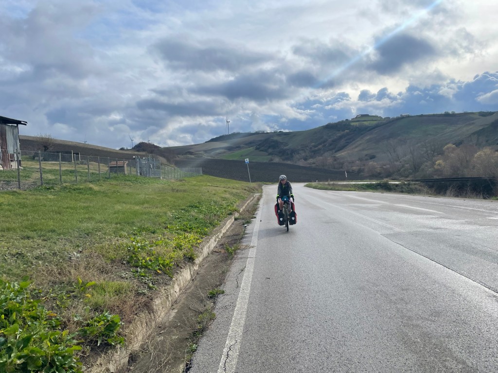 Most importantly, it continued to be predominantly downhill. The temperature felt warmer too and we put our faith in the Bicitalia route to take us to the coast. It was about half past two when we left Candela on marked roads. First on the SP98 which became the SP97 and which then turned northwards slightly, into the wind for just long enough to notice slowing down, until we flicked back east on the SP91 and zoomed with the wind and the downhill continued.