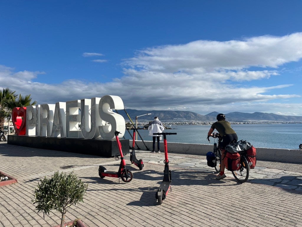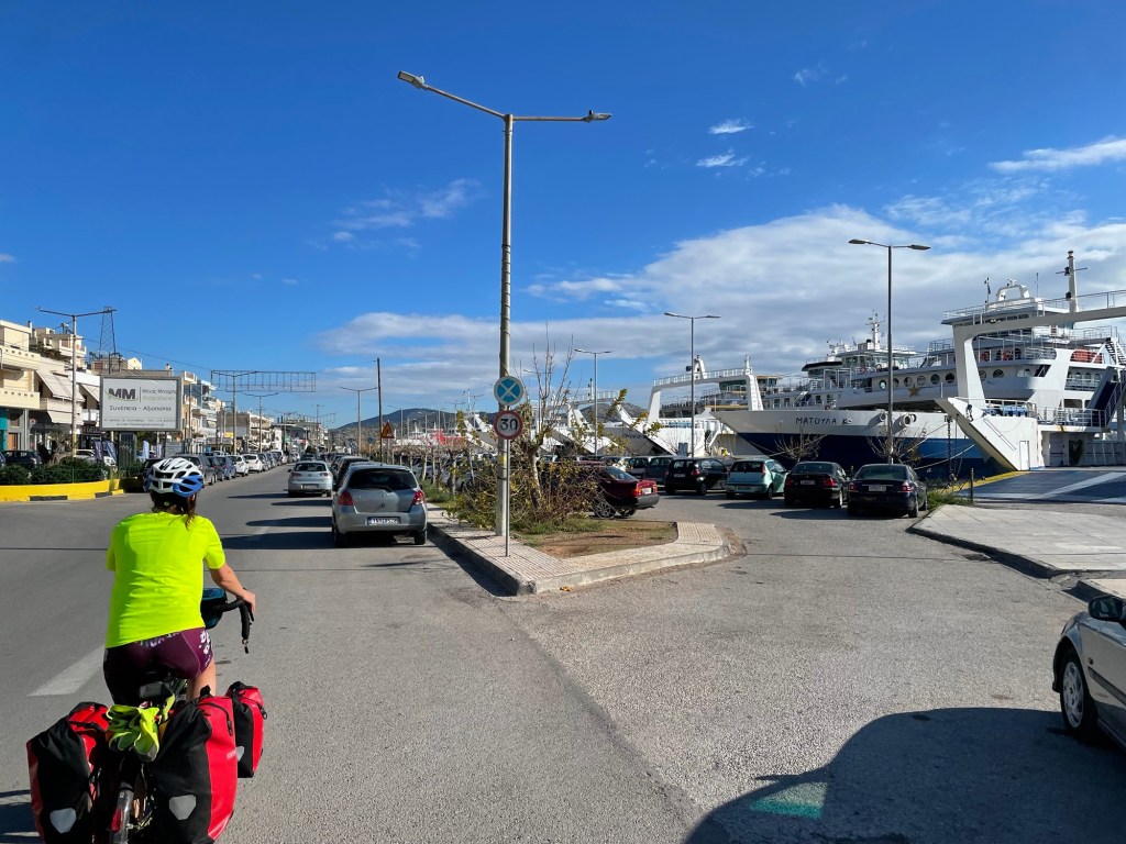 Another ferry was needed to get back to the mainland. The port at Salamina was enormous. Lines of large ferries were docked. It was only €1.20 for the ferry to Perama, no charge for a bicycle. We were crossing the straits where the famous Persian defeat to the Greeks in the Battle of Salamis took place. There must have been plenty to see, but we were solely focused on getting to Athens.