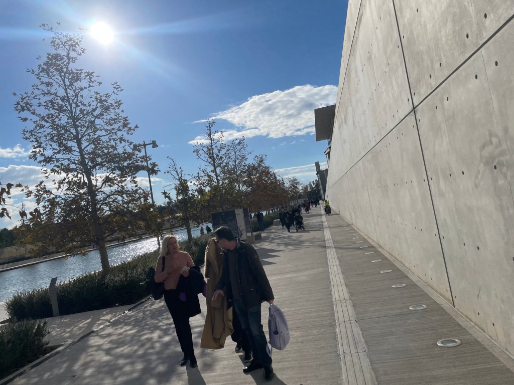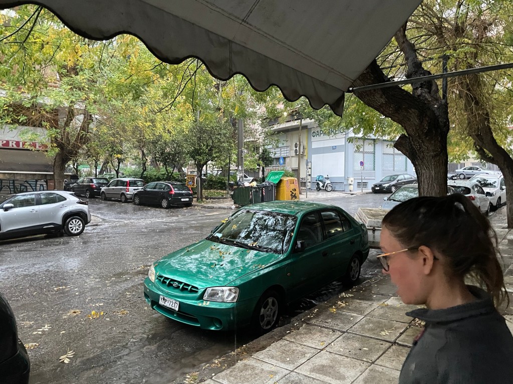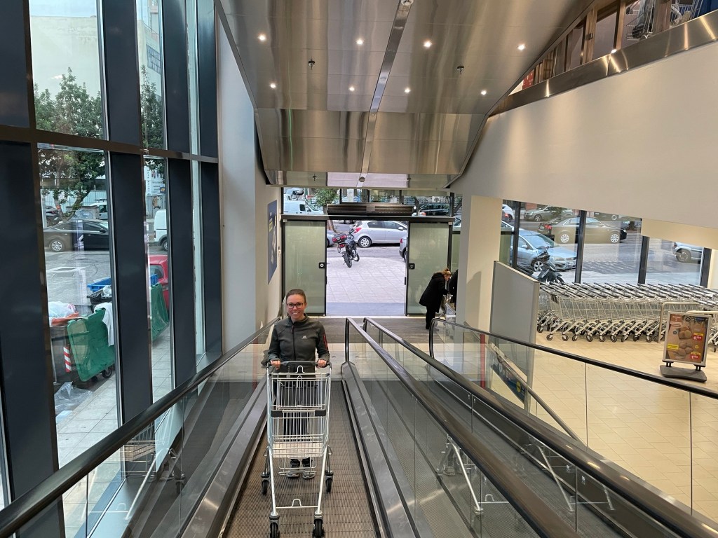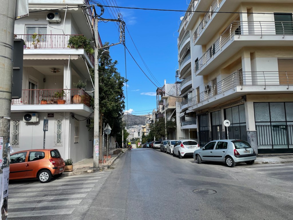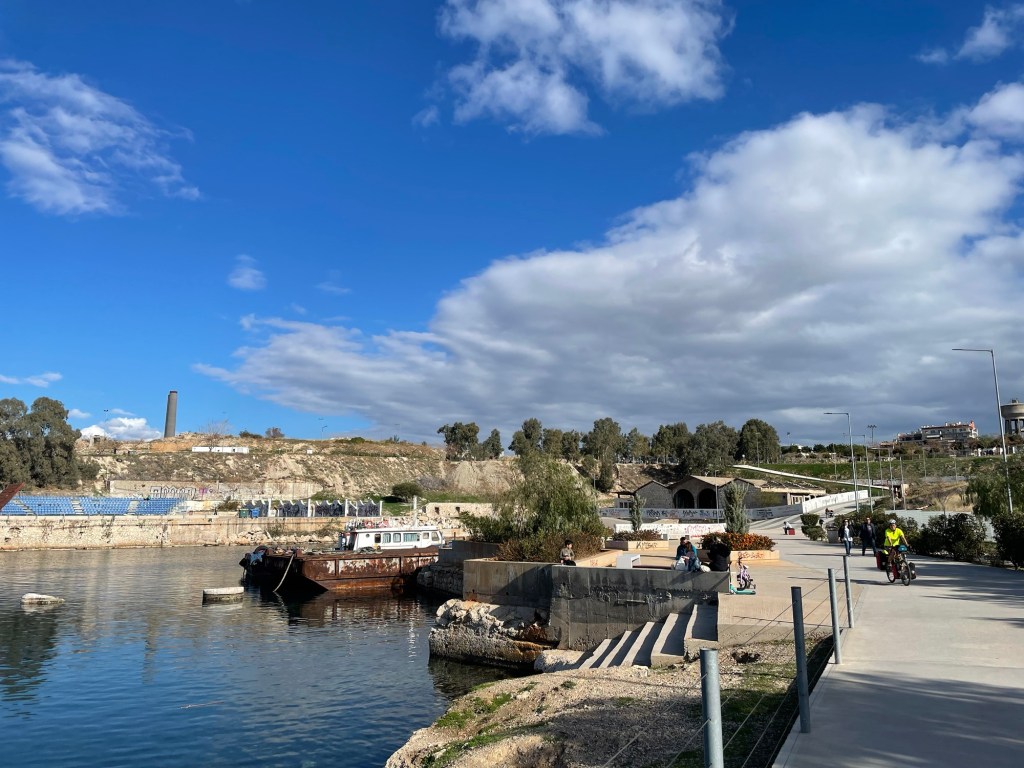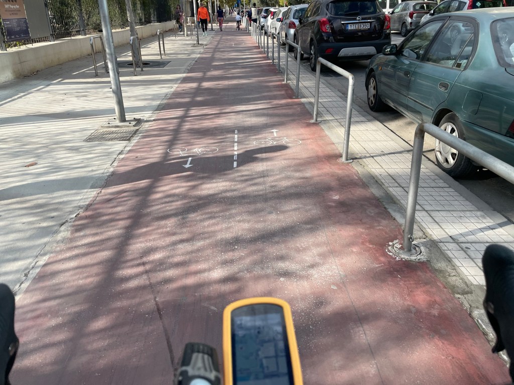 Once we were past the Peace and Friendship Stadium with its attached park, we got chucked onto another stroad. Another mile or so and we were heading past a shopping centre, finally away from the cars and we found all the Greeks equally enjoying the rare, walkable streets. We were also led onto what is presumably the only cycle path in Athens.