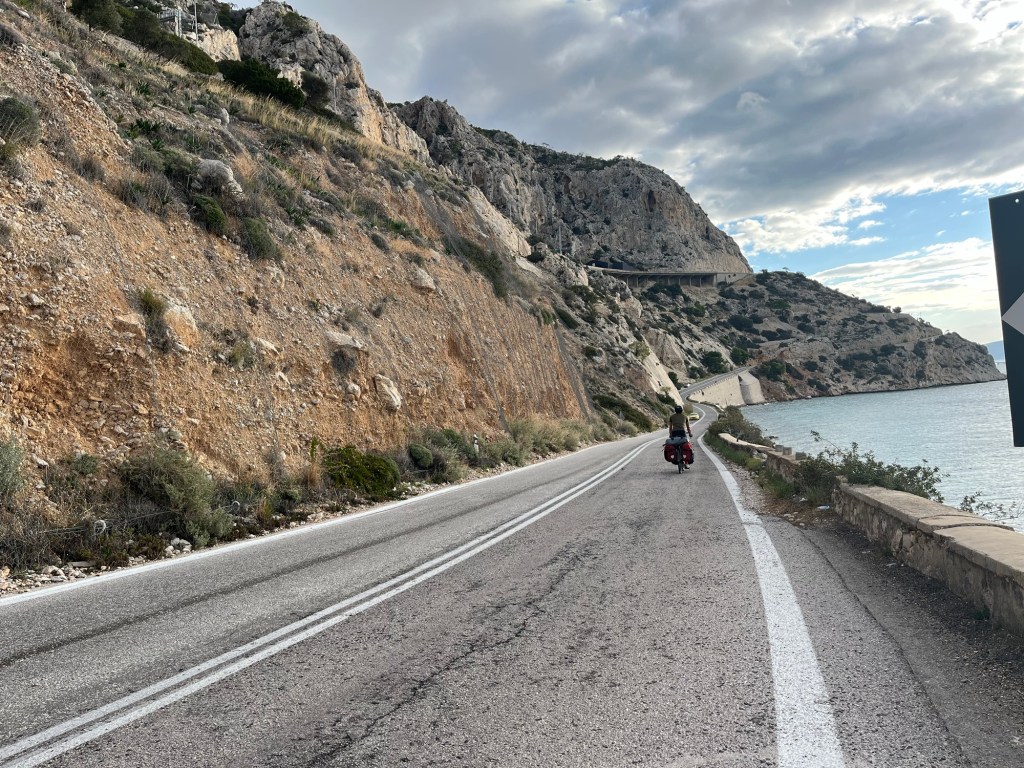 We didn’t bother with breakfast before we left, and set off swiftly, once again on the national road. The road was very close to the sea and after Kineta it was right on the edge, obviously a beautiful place to be, above the endless blue. We were then treated to one of the highlights of the national road.