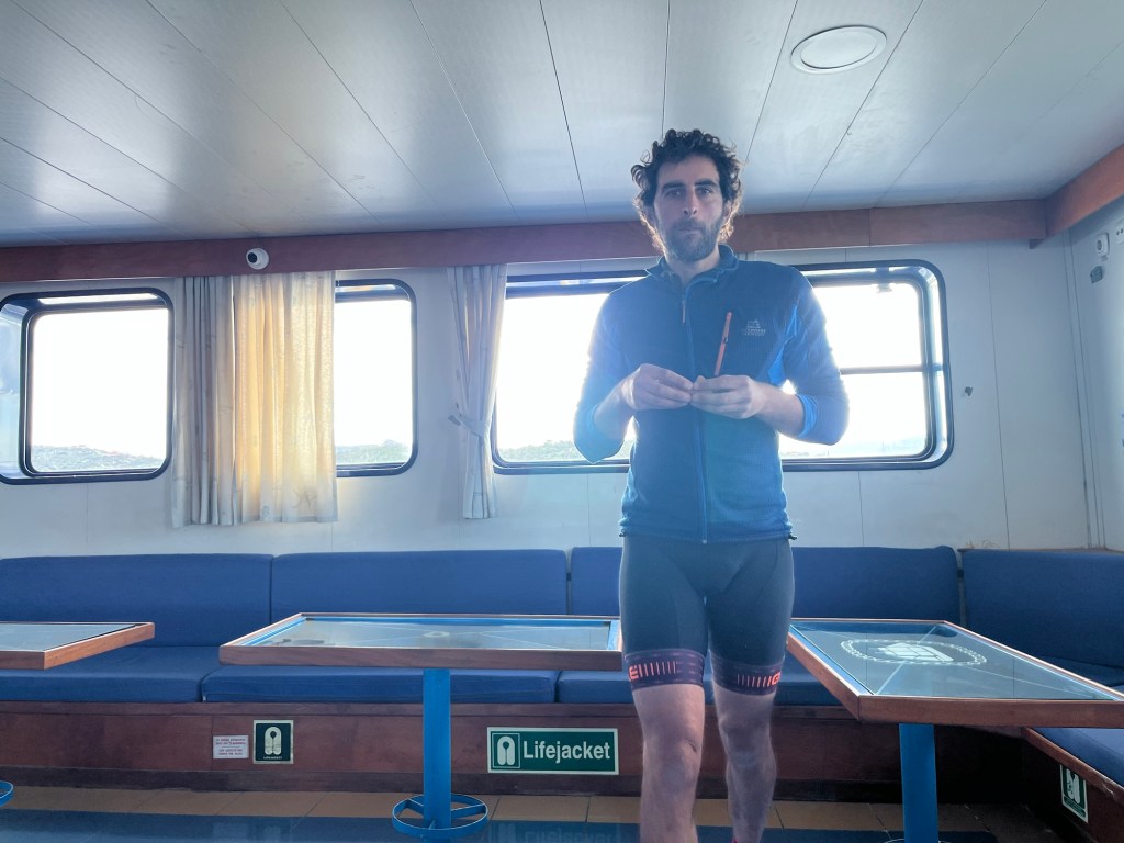 We needn’t have bothered. On the deck of the fairly large ferry, for a relatively short crossing, there were three men sitting and chilling. We rode on and they advised us it would be about twenty minutes before we left. A cafe was at the port so we nipped over, hopeful for some caffeine. Alas, the electricity was out and the ‘barista’ was heating water on gas stoves for instant coffee. Far too used to the good stuff, we bought some cartons of fruit juice instead.