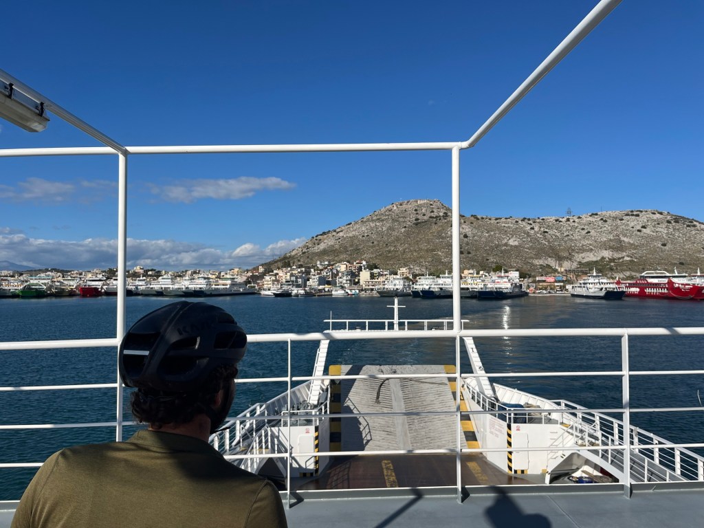 As we walked back onto the ferry there were two other local cyclists who’d arrived and were inspecting our bikes. We chatted for a bit as they were interested in our adventure. We sat upstairs and stuffed in some bread and jam, washing it down with juice. The ferry soon began to move. It wasn’t far to Salamis, fifteen minutes maybe. We let all the cars go and slowly disembarked, lingering for a moment on the dock.