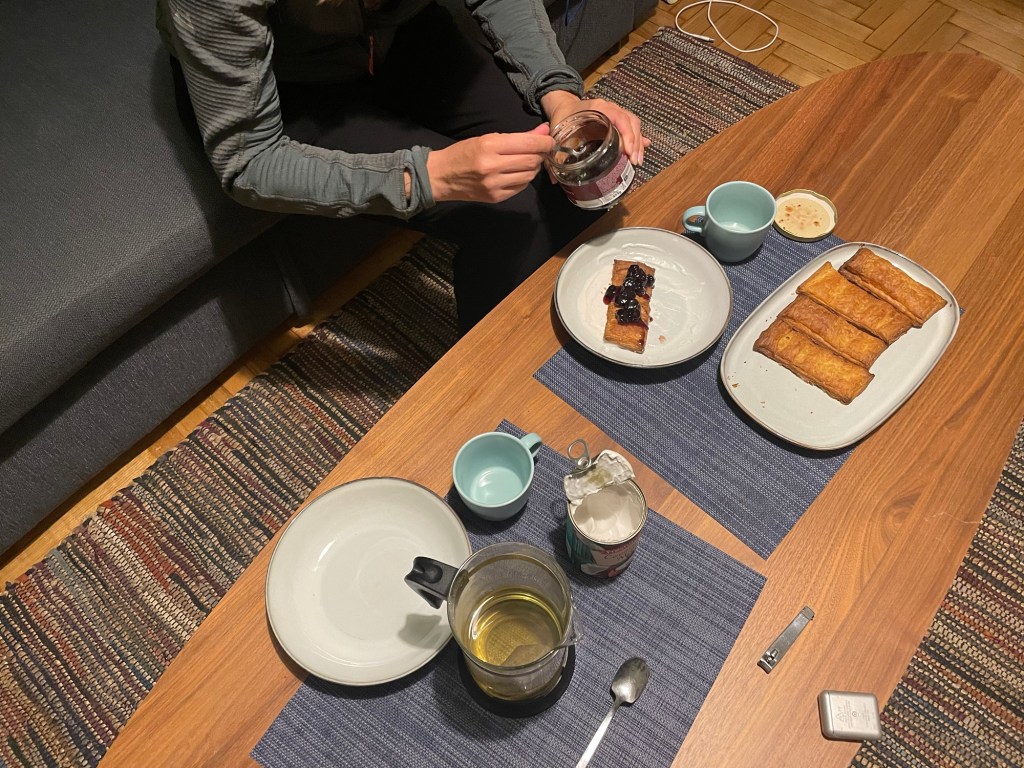 Back at the flat we had another roast dinner. Pretty much the same as before but no less enjoyable, only missing cranberry sauce. It’s not a thing in Greece. For dessert we had millifeule. Kind of. Pastry and cherries in syrup with lashings of coconut milk. The coconut milk here is 91% coconut and is basically cream. We watched more easy going films and monged out.