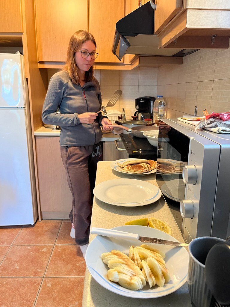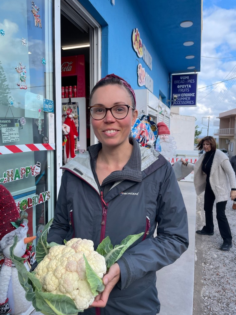 We decided to head to the Minoan ruins called Rousolakkos. It was an entire town that had been unearthed and had been systemically excavated. We didn’t spend too long there and soon headed back to the house. The weather was overcast and rather windy. Back at home we had a lentil dahl and roasted half of the delicious cauliflower. Frankie tried to make cinnamon rolls but the flour failed to rise properly so they were a kind of pastry instead.